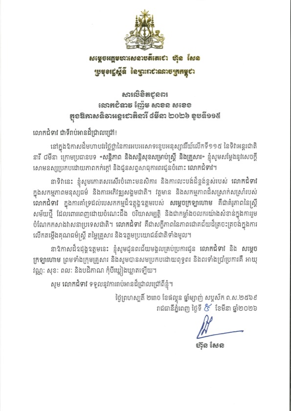 សម្តេចតេជោ ហ៊ុន សែន ប្រមុខរដ្ឋស្តីទី ផ្ញើសារលិខិតជូនពរ លោកជំទាវ ញ៉ែម សាខន សខេង ក្នុងឱកាសប្រារព្ធខួបលើកទី ១១៥ ទិវាអន្តរជាតិនារី ៨មីនា ឆ្នាំ២០២៦