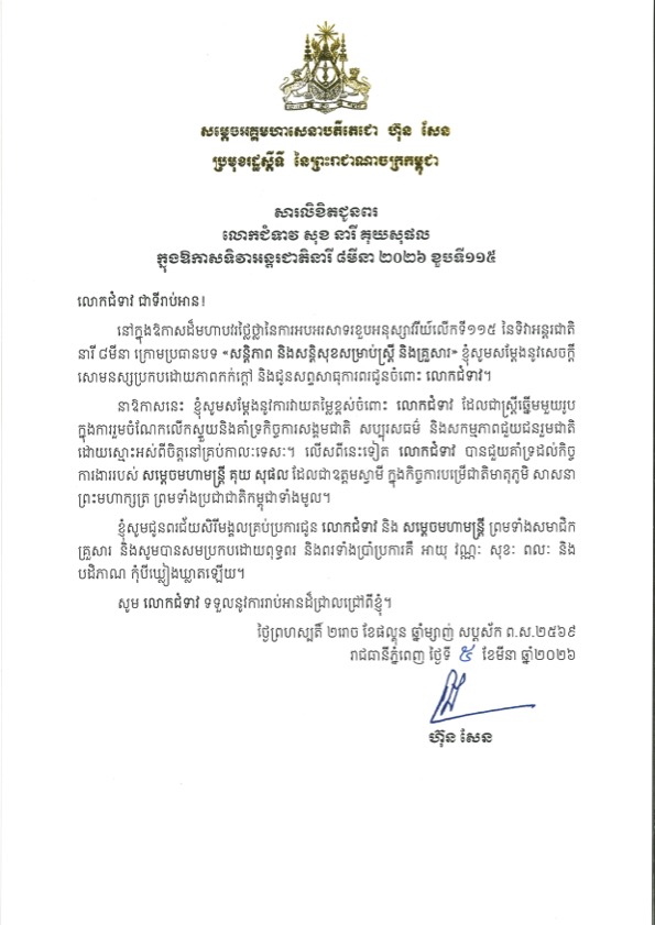 សម្តេចតេជោ ហ៊ុន សែន ប្រមុខរដ្ឋស្តីទី បានផ្ញើសារជូនពរ លោកជំទាវ សុខ នារី គុយសុផល នៅក្នុងឱកាសប្រារព្ធខួបលើកទី ១១៥ ទិវាអន្តរជាតិនារី ៨មីនា ឆ្នាំ២០២៦ ដែលធ្វើឡើងក្រោមប្រធានបទ «សន្តិភាព និងសន្តិសុខសម្រាប់ស្ត្រី និងគ្រួសារ»។