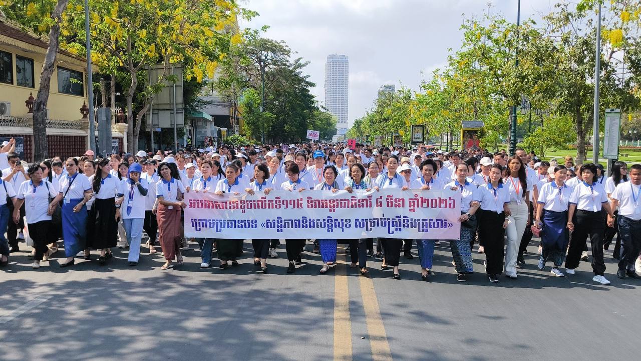 (ភ្នំពេញ)៖ លោកជំទាវបណ្ឌិត ពេជ ចន្ទមុន្នី ហ៊ុនម៉ាណែត ស្ត្រីទី១ របស់កម្ពុជា នាព្រឹកថ្ងៃទី១២ ខែមីនា ឆ្នាំ២០២៦នេះ បានអញ្ជើញជាអធិបតីភាពក្នុងព្រឹត្តិការណ៍ដើរ “ដើម្បីសន្តិភាពយូរអង្វែង សម្រាប់យើងទាំងអស់គ្នា” ក្នុងយុទ្ធនាការអបអរសាទរខួបលើកទី១១៥ ទិវាអន្តរជាតិនារី ៨មីនា ឆ្នាំ២០២៦ ដែលពិធីដើរចាប់ផ្តើមពីមុខវត្តបទុមវតី ឆ្ពោះទៅវត្តភ្នំ ក្នុងរាជធានីភ្នំពេញ ដោយមានអ្នកចូលរួមប្រមាណ ១ ៧០០នាក់ ។