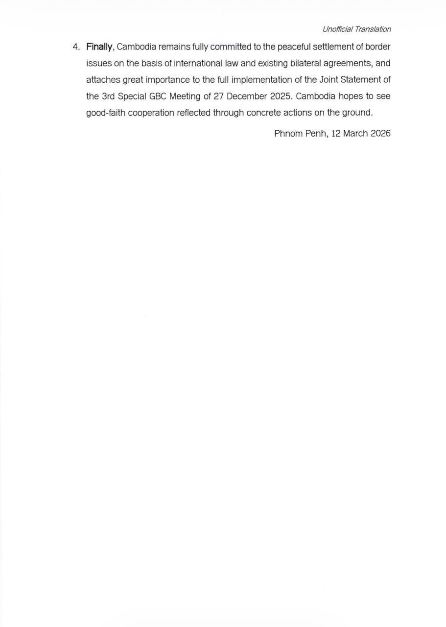 ក្រសួងការបរទេស បានបញ្ជាក់បន្ថែមទៀតថា កម្ពុជានៅតែប្តេជ្ញាចិត្តយ៉ាងពេញលេញចំពោះដំណោះស្រាយបញ្ហាព្រំដែនដោយ សន្តិវិធីដោយផ្អែកលើច្បាប់អន្តរជាតិ និងកិច្ចព្រមព្រៀងទ្វេភាគីដែលមានស្រាប់ ហើយផ្តល់សារសំខាន់យ៉ាងខ្លាំងចំពោះការអនុវត្តពេញលេញនៃសេចក្តីប្រកាសរួមនៃកិច្ចប្រជុំពិសេសលើកទី៣ របស់គណៈកម្មាធិការព្រំដែនទូទៅ ថ្ងៃទី២៧ ខែធ្នូ ឆ្នាំ២០២៥។ កម្ពុជាសង្ឃឹមថា នឹងឃើញកិច្ចសហប្រតិបត្តិការប្រកបដោយភាពស្មោះត្រង់ ដែលឆ្លុះបញ្ចាំងតាម រយៈសកម្មភាពជាក់ស្តែង៕