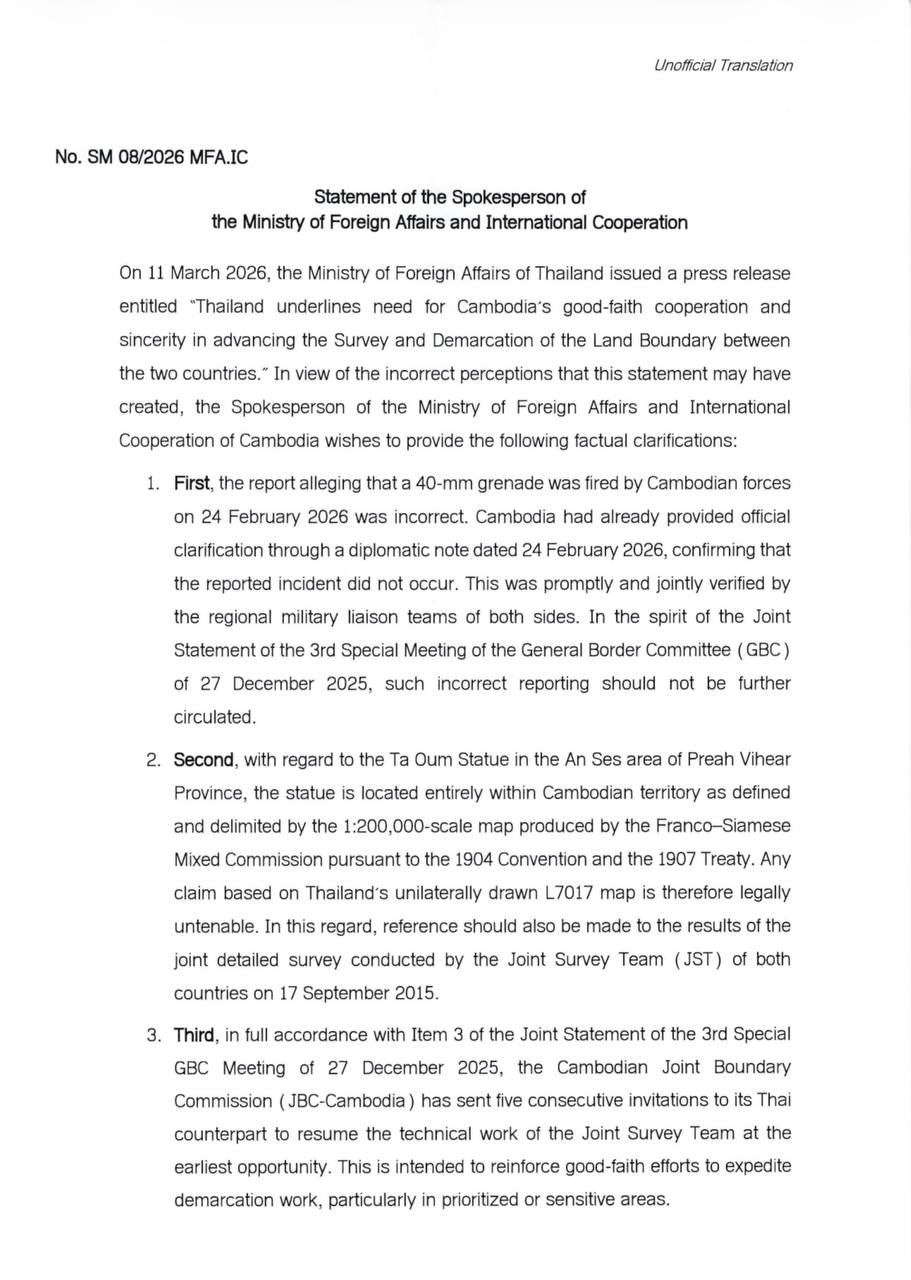 ទី១៖ របាយការណ៍ដែលចោទប្រកាន់ថា គ្រាប់បែកប្រភេទ៤០មីលីម៉ែត្រ ដែលត្រូវបានបាញ់ដោយ កងកម្លាំងកម្ពុជា កាលពីថ្ងៃទី២៤ ខែកុម្ភៈ ឆ្នាំ២០២៦ គឺមិនត្រឹមត្រូវទេ។ កម្ពុជាបានផ្តល់ការបំភ្លឺជា ផ្លូវការរួចហើយតាមរយៈកំណត់ទូតចុះថ្ងៃទី២៤ ខែកុម្ភៈ ឆ្នាំ ២០២៦ ដោយបានបញ្ជាក់ថា ហេតុការណ៍ ដែលបានរាយការណ៍នោះ ពុំបានកើតឡើងឡើយ។ បញ្ហានេះត្រូវបានផ្ទៀងផ្ទាត់រួមគ្នាភ្លាមៗ ដោយ ក្រុមទំនាក់ទំនងយោធាក្នុងតំបន់របស់ភាគីទាំងពីរ។ ផ្អែកតាមស្មារតីនៃសេចក្តីប្រកាសរួមនៃកិច្ចប្រជុំ ពិសេសលើកទី៣ របស់គណៈកម្មាធិការព្រំដែនទូទៅ (GBC) ថ្ងៃទី២៧ ខែធ្នូ ឆ្នាំ២០២៥ ការ រាយការណ៍មិនត្រឹមត្រូវបែបនេះមិនគួរបន្តផ្សព្វផ្សាយទៀតឡើយ។