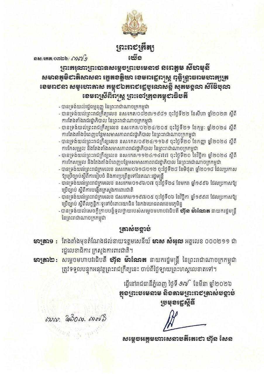 (ភ្នំពេញ)៖ ប្រមុខរដ្ឋស្តីទី សម្តេចតេជោ ហ៊ុន សែន នៅថ្ងៃទី១៧ ខែមីនា ឆ្នាំ២០២៦នេះ បានចេញព្រះរាជក្រឹត្យតែងតាំងនាយឧត្តមសេនីយ៍ មាស សំអុល ជារដ្ឋលេខាធិការក្រសួងការពារជាតិ។