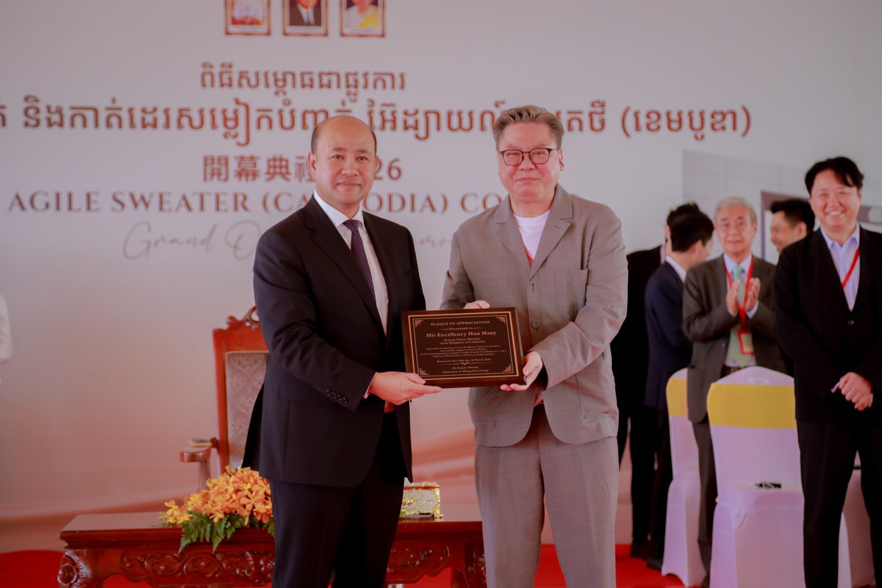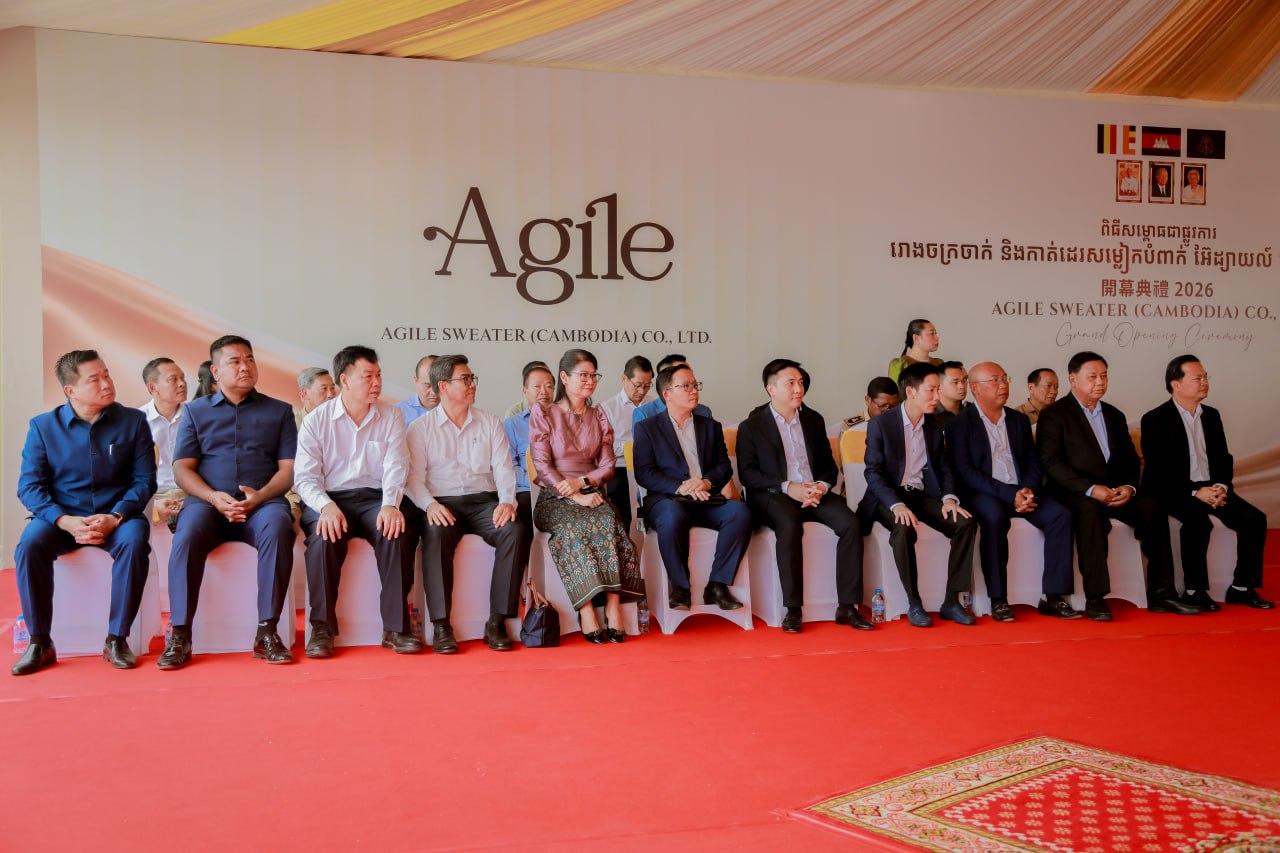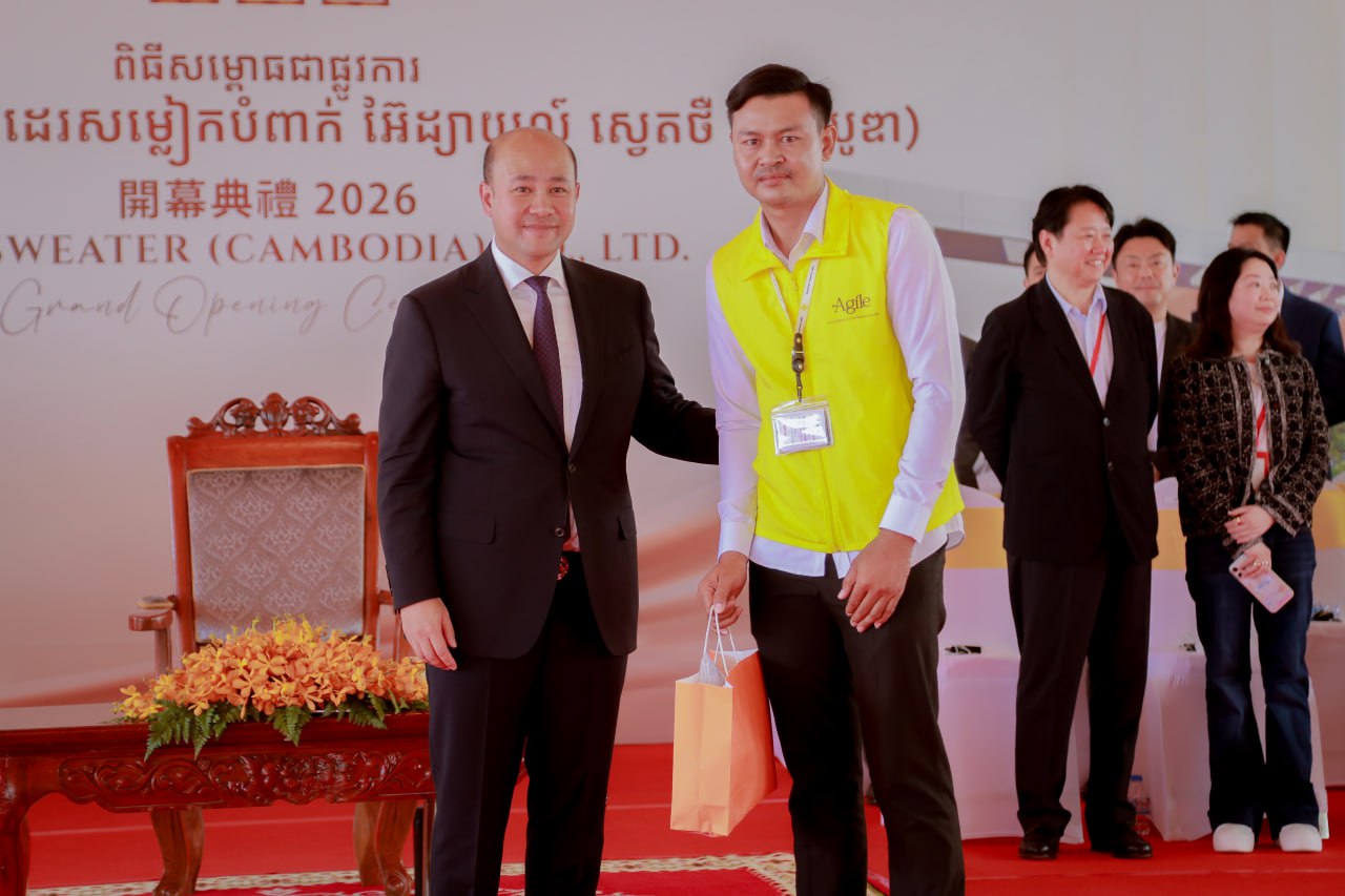 (កំពង់ស្ពឺ)៖ នាព្រឹកថ្ងៃទី១៨ ខែមីនា ឆ្នាំ២០២៦នេះ ឯកឧត្តម ហ៊ុន ម៉ានី ឧបនាយករដ្ឋមន្ដ្រី រដ្ឋមន្ដ្រីក្រសួងមុខងារសាធារណៈ និងជាប្រធានក្រុមការងារគណបក្សចុះមូលដ្ឋានខេត្តកំពង់ស្ពឺ បានអញ្ជើញជាអធិបតីក្នុងពិធីសម្ពោធជាផ្លូវការរោងចក្រចាក់ និងកាត់ដេរសម្លៀកបំពាក់អ៊ែដ្យាយល៍ ស្វេតថឺ (ខេមបូឌា) Agile Sweater (Cambodia) នៅភូមិបុរីកម្មករ សង្កាត់ច្បារមន ក្រុងច្បារមន ខេត្តកំពង់ស្ពឺ។