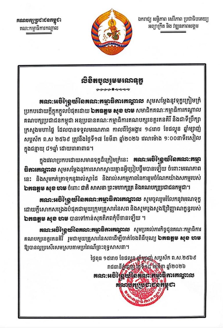 (ភ្នំពេញ)៖ គណៈអចិន្ត្រៃយ៍ នៃគណៈកម្មាធិការកណ្ដាល គណបក្សប្រជាជនកម្ពុជា បានសម្តែងនូវទុក្ខក្រៀមក្រំប្រកបដោយក្តីក្តុកក្ដួលបំផុតដោយឯកឧត្តម សុខ ហម សមាជិកគណៈកម្មាធិការកណ្តាល គណបក្សប្រជាជនកម្ពុជា អនុប្រធានគណៈកម្មាធិការគណបក្សខេត្តរតនគិរី និងជាទីប្រឹក្សាក្រសួងមហាផ្ទៃ ដែលបានទទួលមរណភាព កាលពីថ្ងៃអង្គារ ១៤រោច ខែផល្គុន ឆ្នាំម្សាញ់ សប្ដស័ក ព.ស ២៥៦៩ ត្រូវនឹងថ្ងៃទី១៧ ខែមីនា ឆ្នាំ២០២៦ វេលាម៉ោង១៖០០នាទីរសៀល ក្នុងជន្មាយុ ៨១ឆ្នាំ ដោយរោគាពាធ។