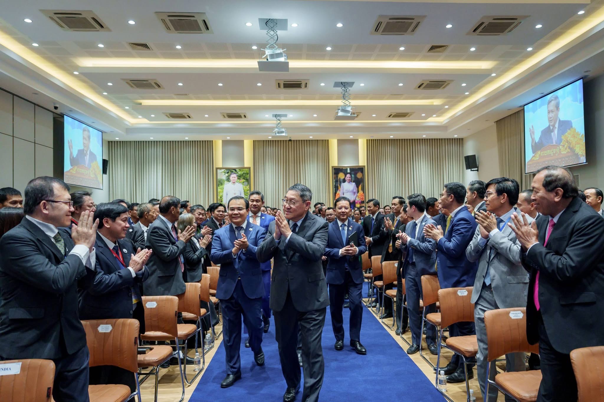 ថ្លែងក្នុងឱកាសបិទសន្និបាត ឯកឧត្តមឧបនាយករដ្ឋមន្ត្រី សុខ ចិន្តាសោភា បានពាំនាំនូវការសាកសួរសុខទុក្ខ និងក្តីនឹករលឹកដ៏ជ្រាលជ្រៅពីសំណាក់ សម្តេចធិបតីនាយករដ្ឋមន្ត្រី និងលោកជំទាវបណ្ឌិត ជូនដល់អង្គសន្និបាតទាំងមូល។ ឯកឧត្តមឧបនាយករដ្ឋមន្ត្រី បានវាយតម្លៃខ្ពស់ចំពោះសមិទ្ធផលដែលក្រសួង-ស្ថាប័នទាំងបីសម្រេចបាន ដែលជាមូលដ្ឋានគ្រឹះដ៏សំខាន់ក្នុងការជំរុញកម្ពុជាឱ្យក្លាយជាប្រទេសដែលមានសន្តិសុខទឹកទាំងបរិមាណ និងគុណភាព។ ជាមួយគ្នានេះ ឯកឧត្តមបានផ្តល់នូវអនុសាសន៍គន្លឹះមួយចំនួនសម្រាប់ក្រសួង, គណៈកម្មាធិការជាតិទន្លេមេគង្គកម្ពុជា និងអាជ្ញាធរទន្លេសាប ដើម្បីតម្រង់ទិសក្នុងការគ្រប់គ្រង អភិរក្ស និងអភិវឌ្ឍន៍ធនធានទឹកឱ្យកាន់តែមានប្រសិទ្ធភាព និងចីរភាពសម្រាប់ឆ្នាំ២០២៦ និងឆ្នាំបន្តបន្ទាប់ទៀត៕