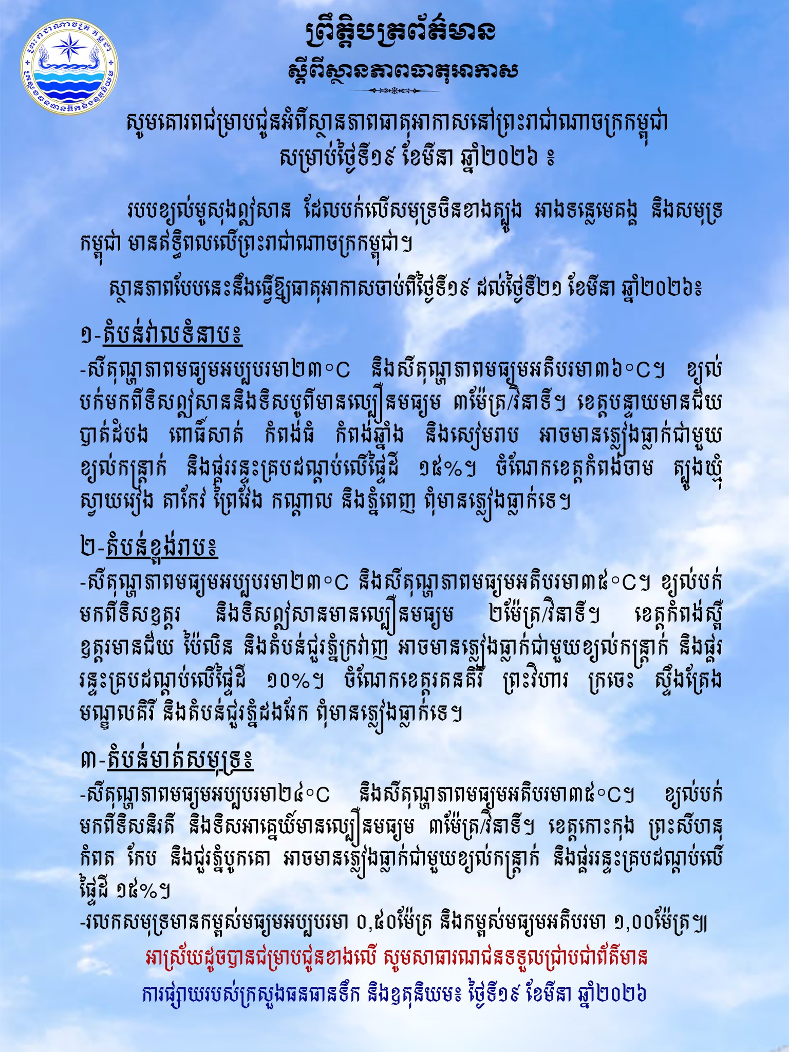 (ភ្នំពេញ)៖ ក្រសួងធនធានទឹក និងឧតុនិយម បានចេញសេចក្តីជូនដំណឹង អំពីស្ថានភាពធាតុអាកាសនៅកម្ពុជា សម្រាប់ថ្ងៃទី១៩ ខែមីនា ឆ្នាំ២០២៦។