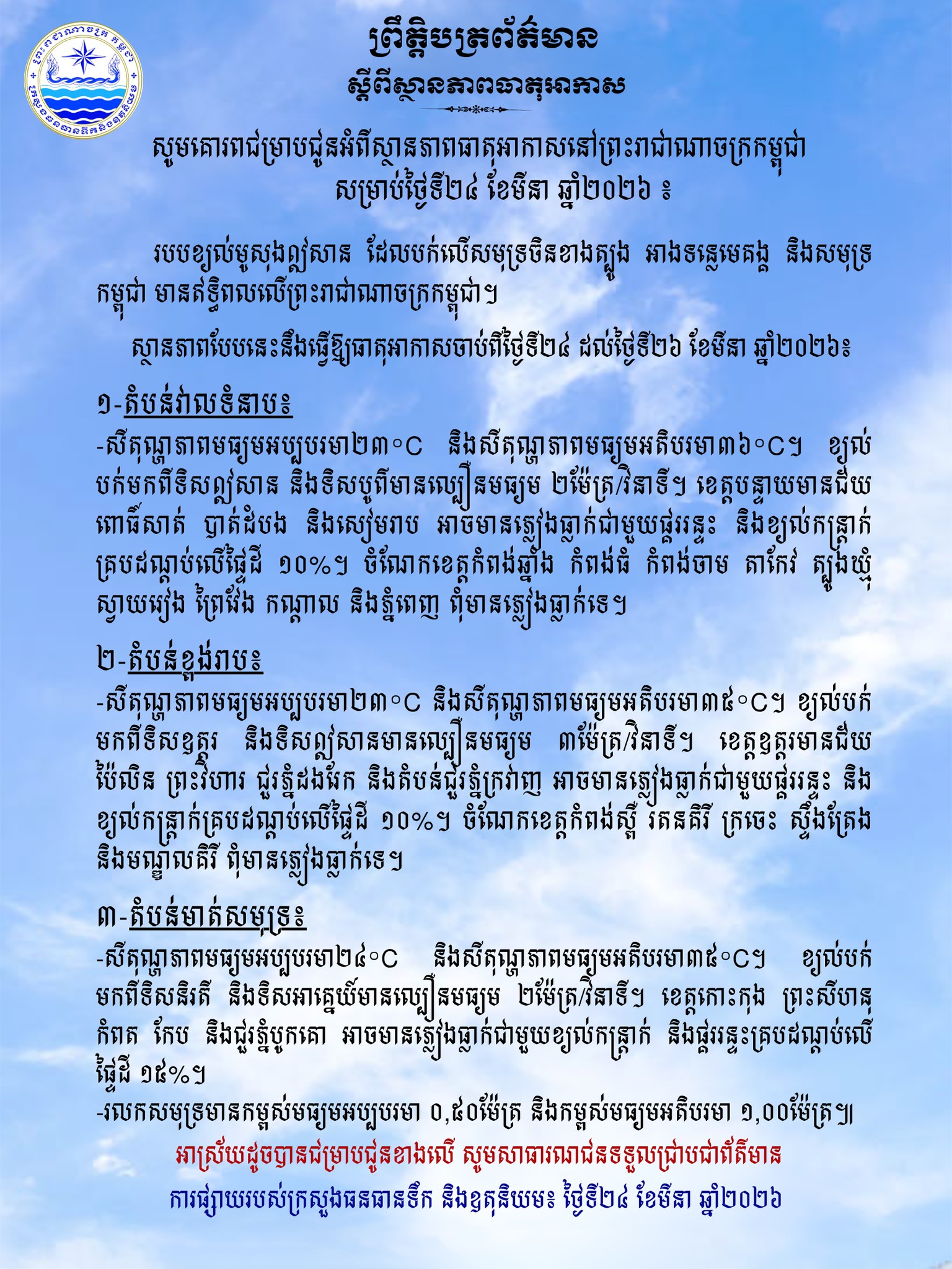 (ភ្នំពេញ)៖ ក្រសួងធនធានទឹក និងឧតុនិយម បានចេញសេចក្តីជូនដំណឹង អំពីស្ថានភាពធាតុអាកាសនៅកម្ពុជា សម្រាប់ថ្ងៃទី២៤ ខែមីនា ឆ្នាំ២០២៦។
