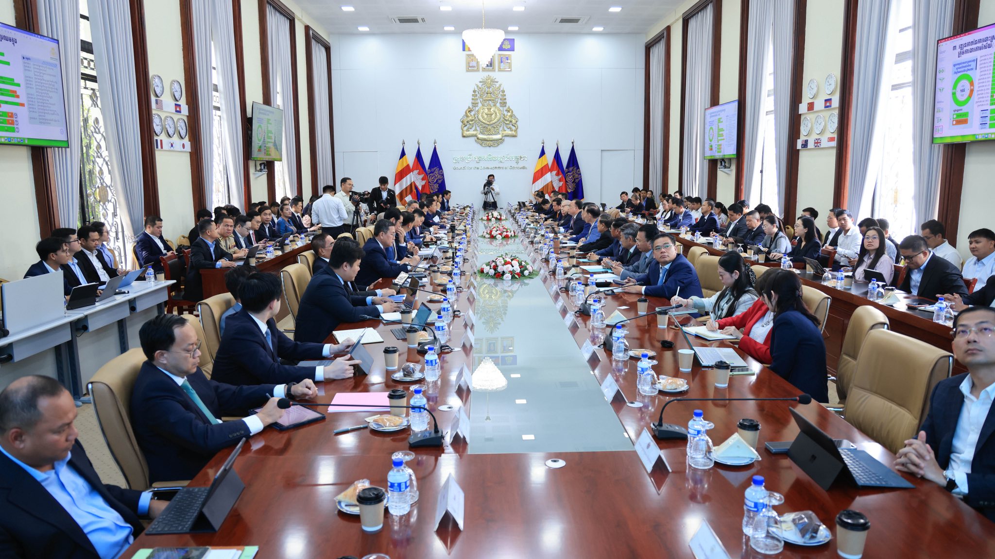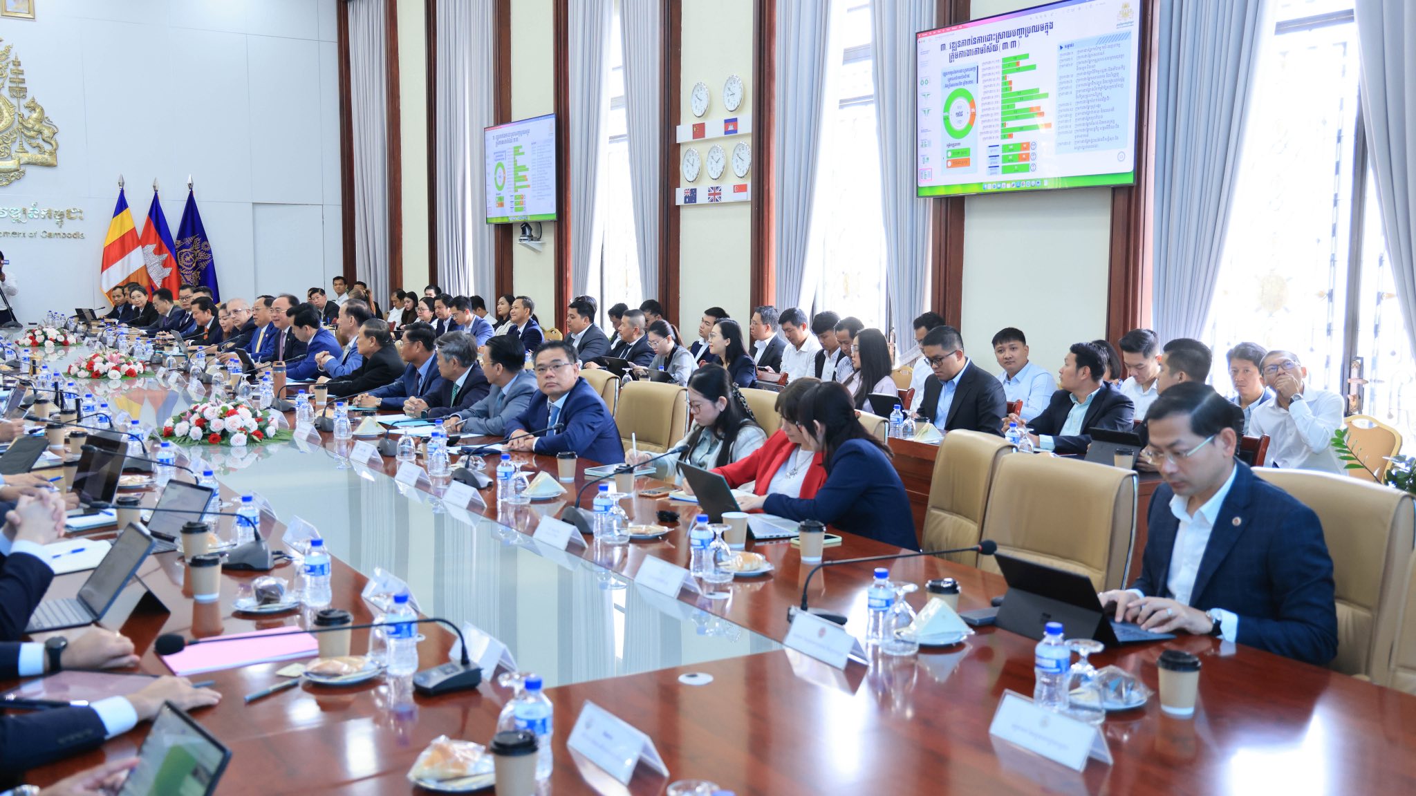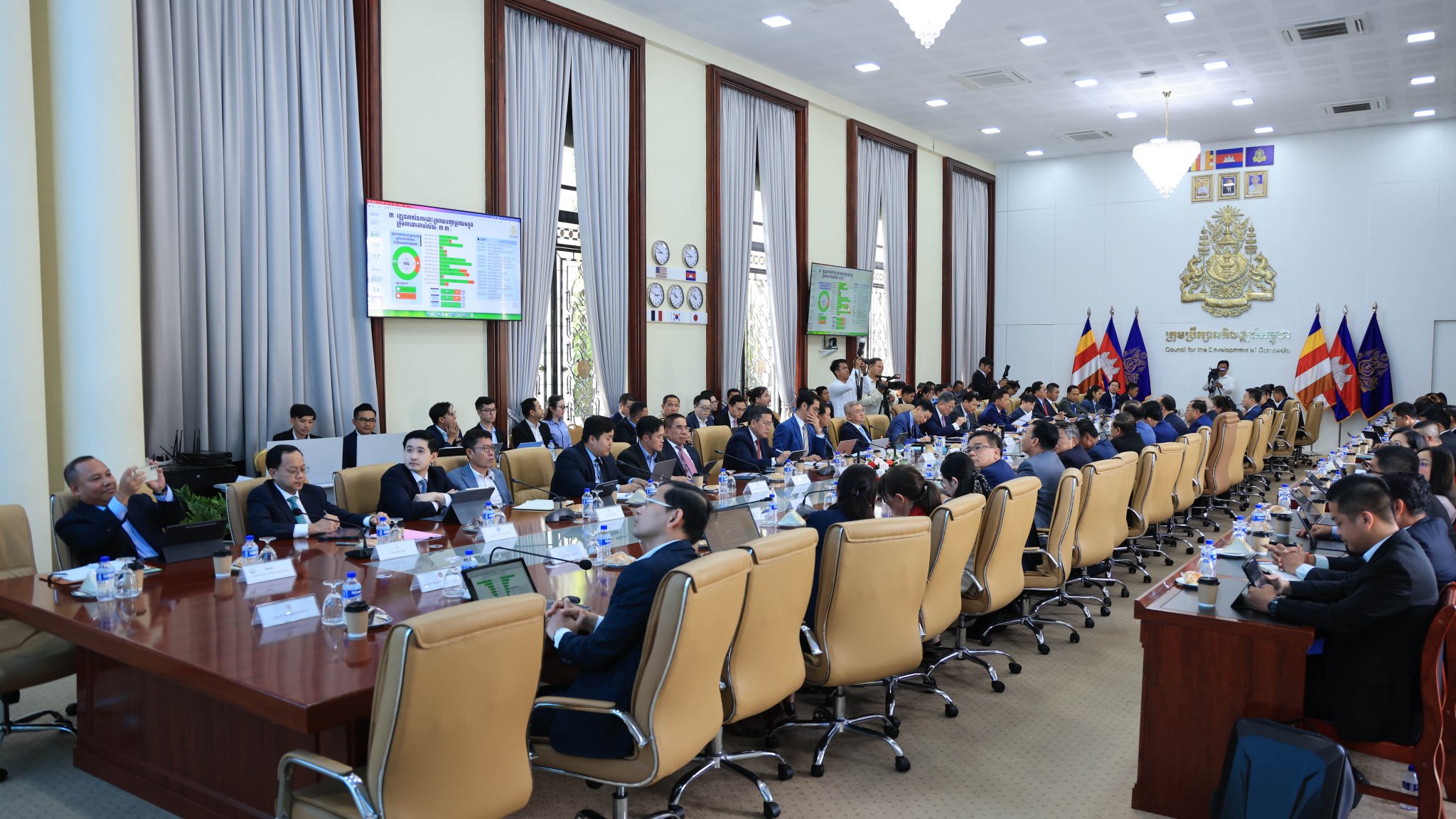 (ភ្នំពេញ)៖ អ្នកឧកញ៉ា គិត ម៉េង ប្រធានសភាពាណិជ្ជកម្មកម្ពុជា និងជាប្រធានគណៈកម្មការសម្របសម្រួល ក្រុមការងារផ្នែកឯកជន សម្រាប់យន្តការវេទិការាជរដ្ឋាភិបាល-ផ្នែកឯកជន (គ.ស.ឯ.រ.ជ) នៅព្រឹកថ្ងៃពុធ ទី២៥ ខែមីនា ឆ្នាំ២០២៦ បានដឹកនាំសហប្រធានក្រុមការងារផ្នែកឯកជន និងអនុប្រធាននៃគណ:កម្មការសម្របសម្រួល ក្រុមការងារផ្នែកឯកជន គ.ស.ឯ.រ.ជ រួមនិងក្រុមលេខាធិការដ្ឋានក្រុមការងារផ្នែកឯកជន អញ្ជើញចូលរួមក្នុង កិច្ចប្រជុំអន្តរក្រសួង ដើម្បីពិនិត្យពិភាក្សាលើសេចក្តីព្រាងរបាយការណ៍ ស្តីពីវឌ្ឍនភាពការងារប្រចាំឆមាសទី២ ឆ្នាំ២០២៥ នៃយន្តការវេទិការាជរដ្ឋាភិបាល-ផ្នែកឯកជន ក្រោមអធិបតីភាពរបស់លោក ស៊ុន ចាន់ថុល ឧបនាយករដ្ឋមន្ត្រី អនុប្រធានទី១ ក្រុមកប្រឹក្សាអភិវឌ្ឍន៍កម្ពុជា និងជាប្រធានគណៈកម្មការសម្របសម្រួល ក្រុមការងារសម្រាប់យន្តការវេទិការាជរដ្ឋាភិបាល-ផ្នែកឯកជន (គ.ស.រ.ជ)។