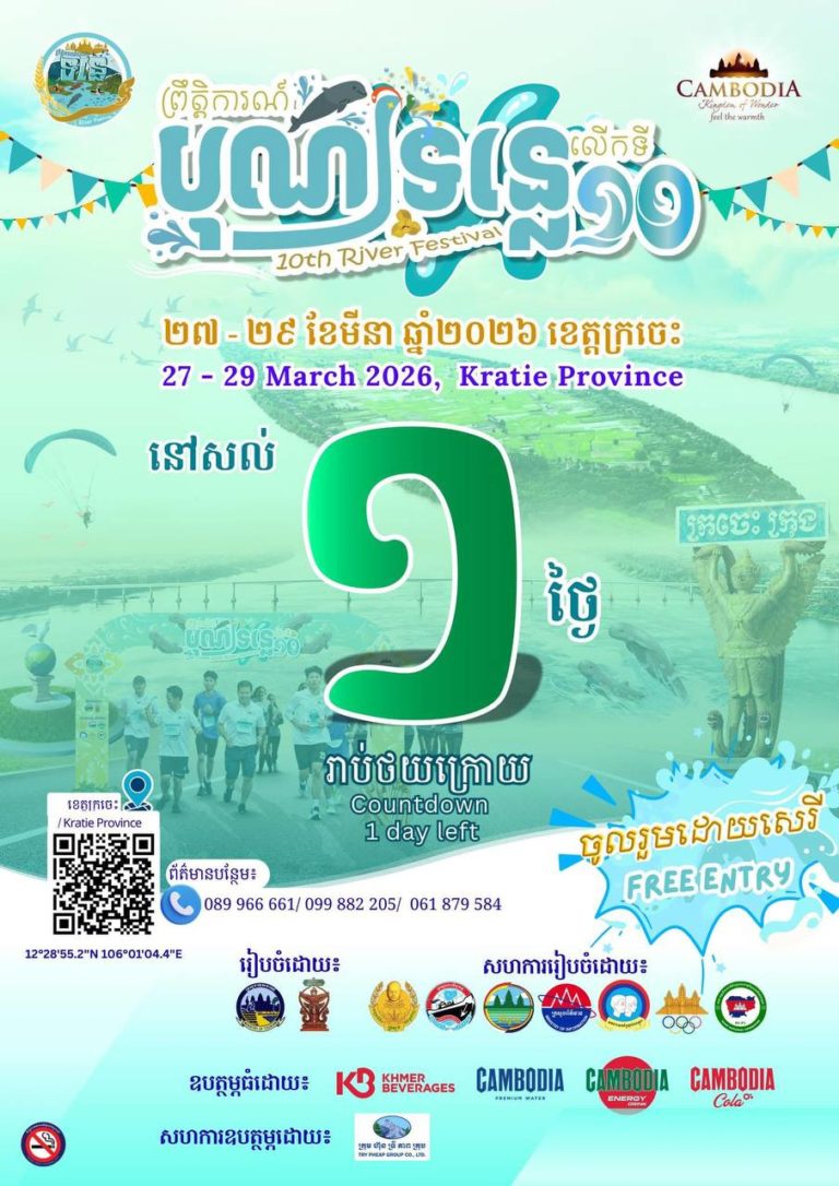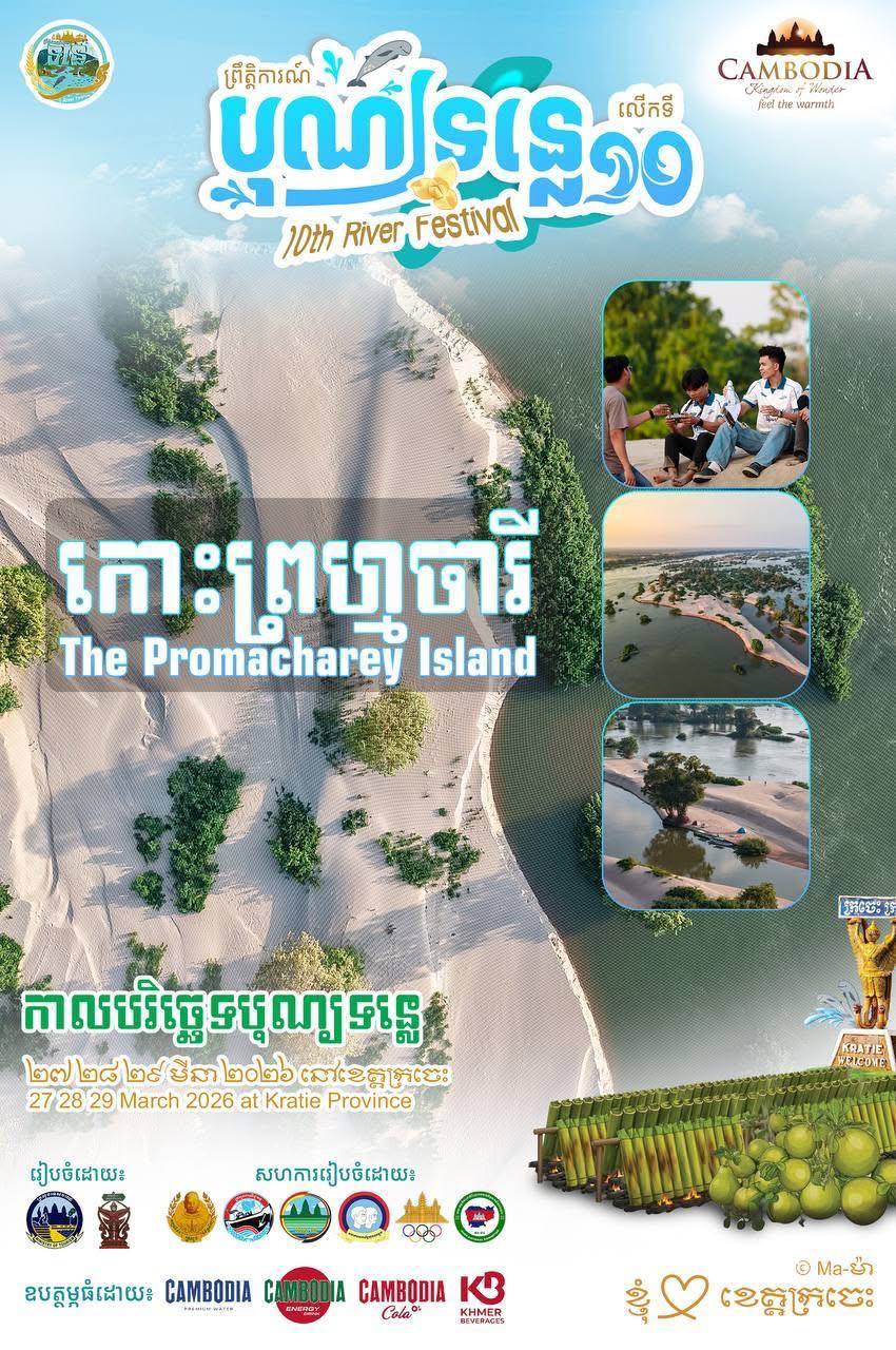 (ក្រចេះ)៖ ព្រឹត្តិការណ៍បុណ្យទន្លេលើកទី១០ នៅខេត្តក្រចេះ ក្រោមប្រធានបទ «ទន្លេបៃតង បេតិកភណ្ឌវប្បធម៌ និងធម្មជាតិមហាសាល» នឹងចាប់ផ្តើមដំណើរការជាផ្លូវការ នៅថ្ងៃស្អែកនេះ ដោយគិតចាប់ពីថ្ងៃទី២៧ ដល់ថ្ងៃទី២៩ ខែមីនា ឆ្នាំ២០២៦។