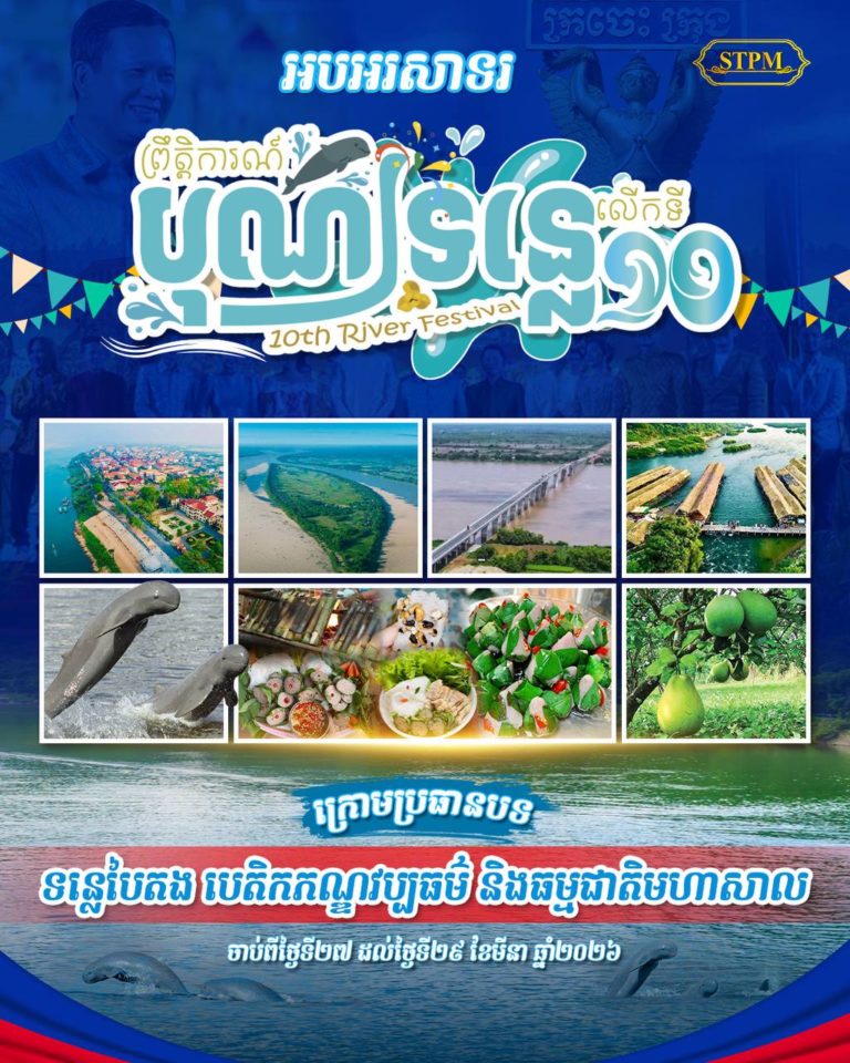 សូមជម្រាបថា ព្រឹត្តិការណ៍បុណ្យទន្លេលើកទី១០ នៅខេត្តក្រចេះ ក្រោមប្រធានបទ «ទន្លេបៃតង បេតិកភណ្ឌវប្បធម៌ និងធម្មជាតិមហាសាល» ចាប់ផ្តើមដំណើរការជាផ្លូវការ នៅថ្ងៃទី២៧ ដល់ថ្ងៃទី២៩ ខែមីនា ឆ្នាំ២០២៦។