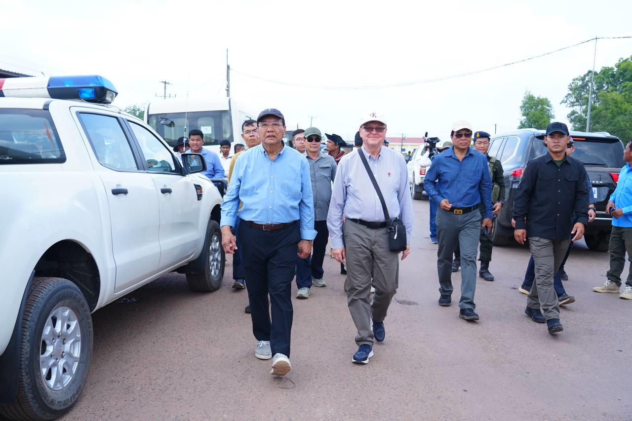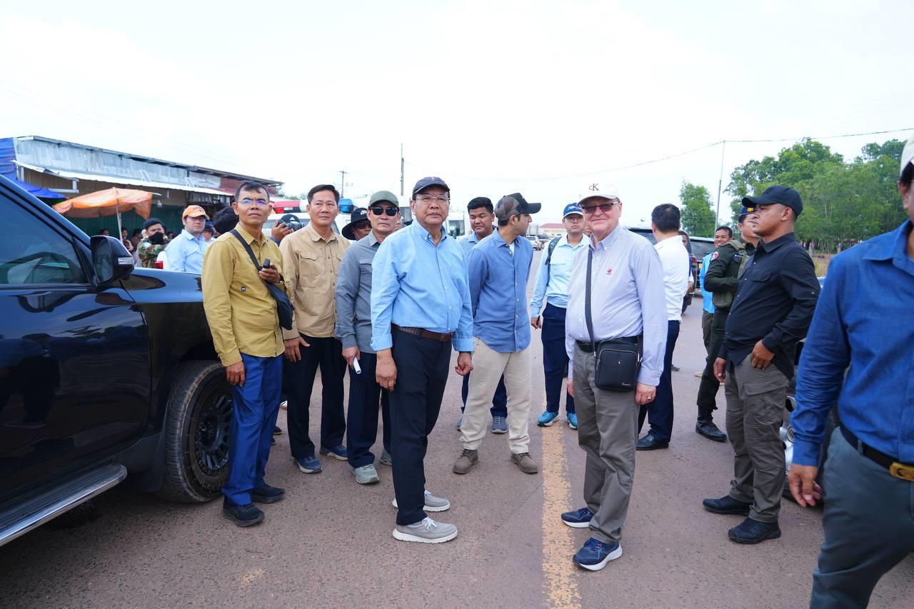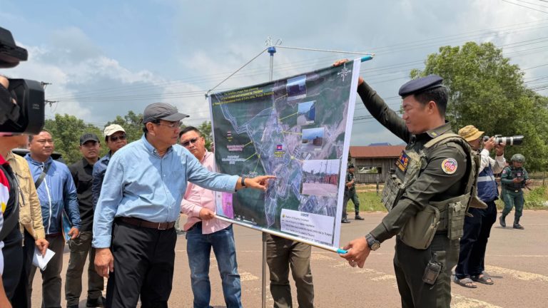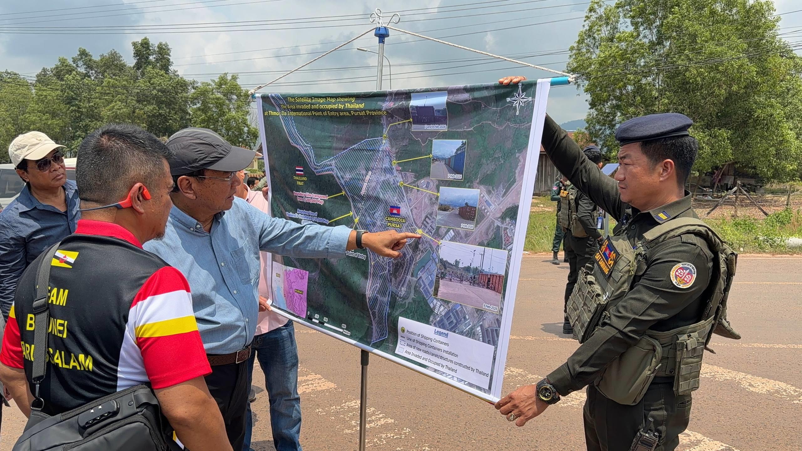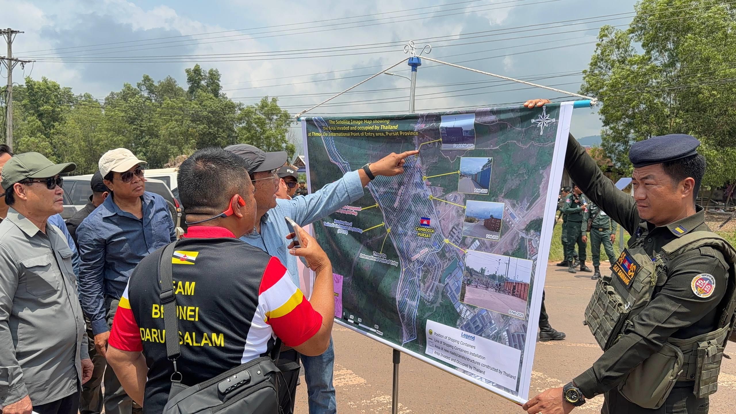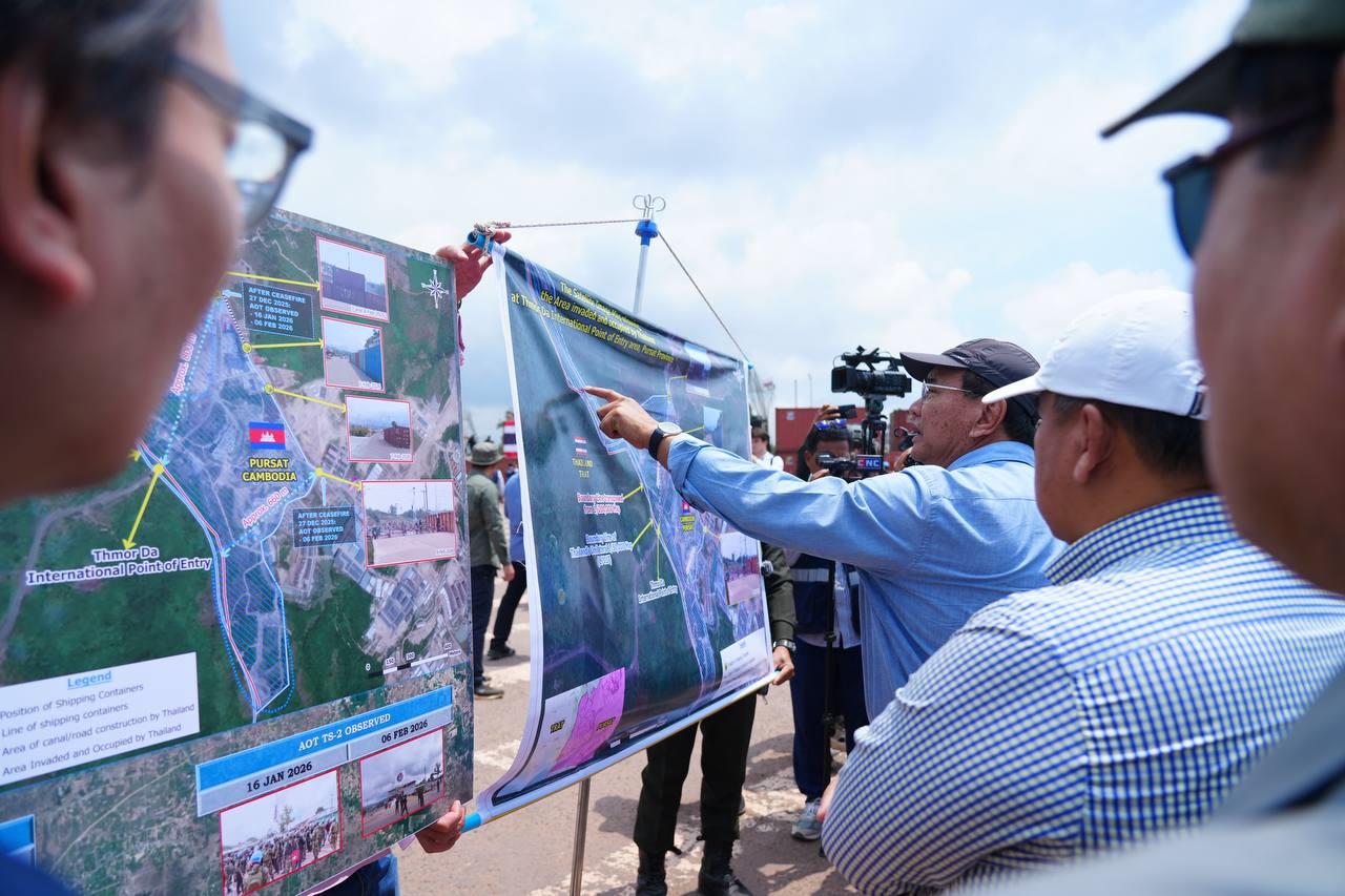 ឯកឧត្តមឧបនាយករដ្ឋមន្ត្រី ប្រាក់ សុខុន រដ្ឋមន្ត្រីក្រសួងការបរទេស និងសហប្រតិបត្តិការអន្តរជាតិ នៅរសៀលថ្ងៃទី២៧ ខែមីនា ឆ្នាំ២០២៦នេះ បានបង្ហាញផែនទីទឹកដីកម្ពុជានៅចំណុចច្រមុះជ្រូក (ផ្លូវបំបែកទៅកោះកុង-កាសុីណូ ) ស្ថិតនៅភូមិសង្គមថ្មី ឃុំថ្មដា ស្រុកវាលវែង ខេត្តពោធិ៍សាត់ ដែលត្រូវយោធាថៃ ចូលមករាយបន្លាលួស និងដាក់ទូកុងតឺន័រ ក្រោយកិច្ចព្រមព្រៀងលើបទឈប់បាញ់ ២៧ធ្នូ ឆ្នាំ២០២៥ ដល់ឯកអគ្គរាជទូត ឯកអគ្គរដ្ឋទូត តំណាងអង្គទូត ព្រមទាំងអង្គការអន្តរជាតិធំៗ ប្រចាំកម្ពុជា។