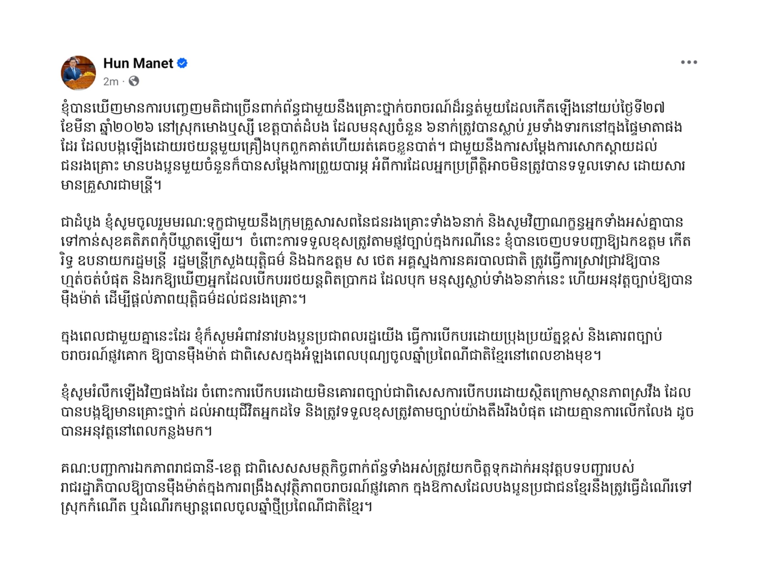 (ភ្នំពេញ)៖ តាមរយៈសំណេរបង្ហោះលើបណ្តាញសង្គមផ្លូវការ នៅព្រឹកថ្ងៃទី៣១ ខែមីនា ឆ្នាំ២០២៦នេះ សម្តេចបវរធិបតី ហ៊ុន ម៉ាណែត នាយករដ្ឋមន្ត្រីនៃកម្ពុជា បានចេញបទបញ្ជាឱ្យឯកឧត្តមឧបនាយករដ្ឋមន្ត្រី កើត រិទ្ធ រដ្ឋមន្ត្រីក្រសួងយុត្តិធម៌ និងឯកឧត្តមនាយឧត្តមសេនីយ៍ ស ថេត អគ្គស្នងការនគរបាលជាតិ ធ្វើការស្រាវជ្រាវឱ្យបានហ្មត់ចត់បំផុត និងរកឱ្យឃើញអ្នកបើកបររថយន្តពិតប្រាកដ ដែលបុកមនុស្សស្លាប់ទាំង៦នាក់ នៅស្រុកមោងឬស្សី ខេត្តបាត់ដំបង ដើម្បីផ្តល់យុត្តិធម៌ដល់ជនរងគ្រោះ។