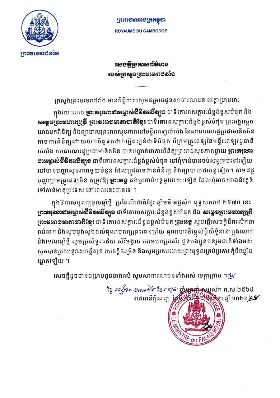 (ភ្នំពេញ)៖ ក្រសួងព្រះបរមរាជវាំង នៅថ្ងៃទី៣១ ខែមីនា ឆ្នាំ២០២៦នេះ បានចេញសេចក្តីប្រកាសព័ត៌មានបញ្ជាក់ថា ក្នុងរយៈពេលព្រះករុណាជាអម្ចាស់ជីវិតលើត្បូង ជាទីគោរពសក្ការៈដ៏ខ្ពង់ខ្ពស់បំផុត និងសម្តេចព្រះមហាក្សត្រី ព្រះវររាជមាតាជាតិខ្មែរ ជាទីគោរពសក្ការៈដ៏ខ្ពង់ខ្ពស់បំផុត ព្រះអង្គស្ដេចយាងមកពិនិត្យ និងព្យាបាលព្រះរាជសុខភាព នៅមន្ទីរពេទ្យប៉េកាំង ប្រទេសចិន តាមការពិនិត្យដោយយកចិត្ត ទុកដាក់ល្អិតល្អន់ជាទីបំផុត ពីក្រុមគ្រូពេទ្យនៃមន្ទីរពេទ្យរដ្ឋធានីប៉េ បានបញ្ជាក់ថា ការពិនិត្យព្រះរាជសុខភាពថ្វាយ ព្រះករុណា ជាអម្ចាស់ជីវិតលើត្បូង ជាទីគោរពសក្ការៈដ៏ខ្ពង់ខ្ពស់បំផុត នៅពុំទាន់បានចប់សព្វគ្រប់នៅឡើយ នៅមានបញ្ហាសុខភាពមួយចំនួន ដែលត្រូវតាមដានពិនិត្យ និងព្យាបាលជាបន្តទៀត។