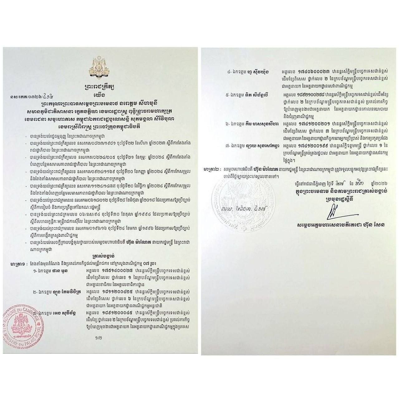 ខាងក្រោមនេះ ជាព្រះរាជក្រឹត្យ របស់សម្ដេចតេជោ ហ៊ុ​ន សែន ប្រមុខរដ្ឋស្ដីទី៖