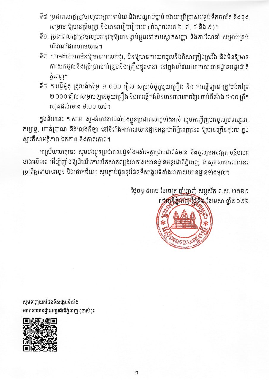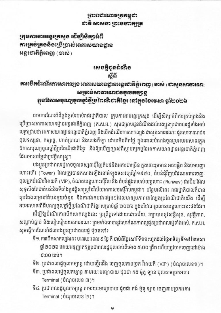 អាកាសយានដ្ឋានអន្តរជាតិភ្នំពេញ នឹងបើកដំណើរការសាកល្បង ជាសួនសាធារណៈ ជូនសាធារណជន ចូលទស្សនា, កម្សាន្ត, ហាត់ប្រាណ និងលេងកីឡា ដោយមិនគិតថ្លៃ ក្នុងគោលបំណងចូលរួមអបអរសាទរក្នុង ឱកាសបុណ្យចូលឆ្នាំថ្មីប្រពៃណីជាតិខ្មែរ និងឱ្យឃើញច្បាស់ពីស្ថាបត្យកម្មនៃអាកាសយានដ្ឋានអន្តរជាតិភ្នំពេញ ដែលមានតម្លៃជាប្រវត្តិសាស្ត្រ។