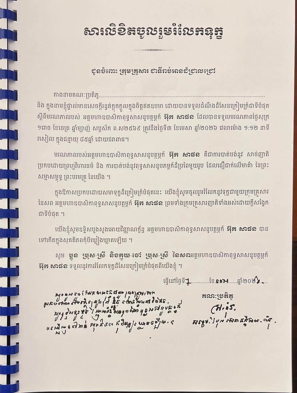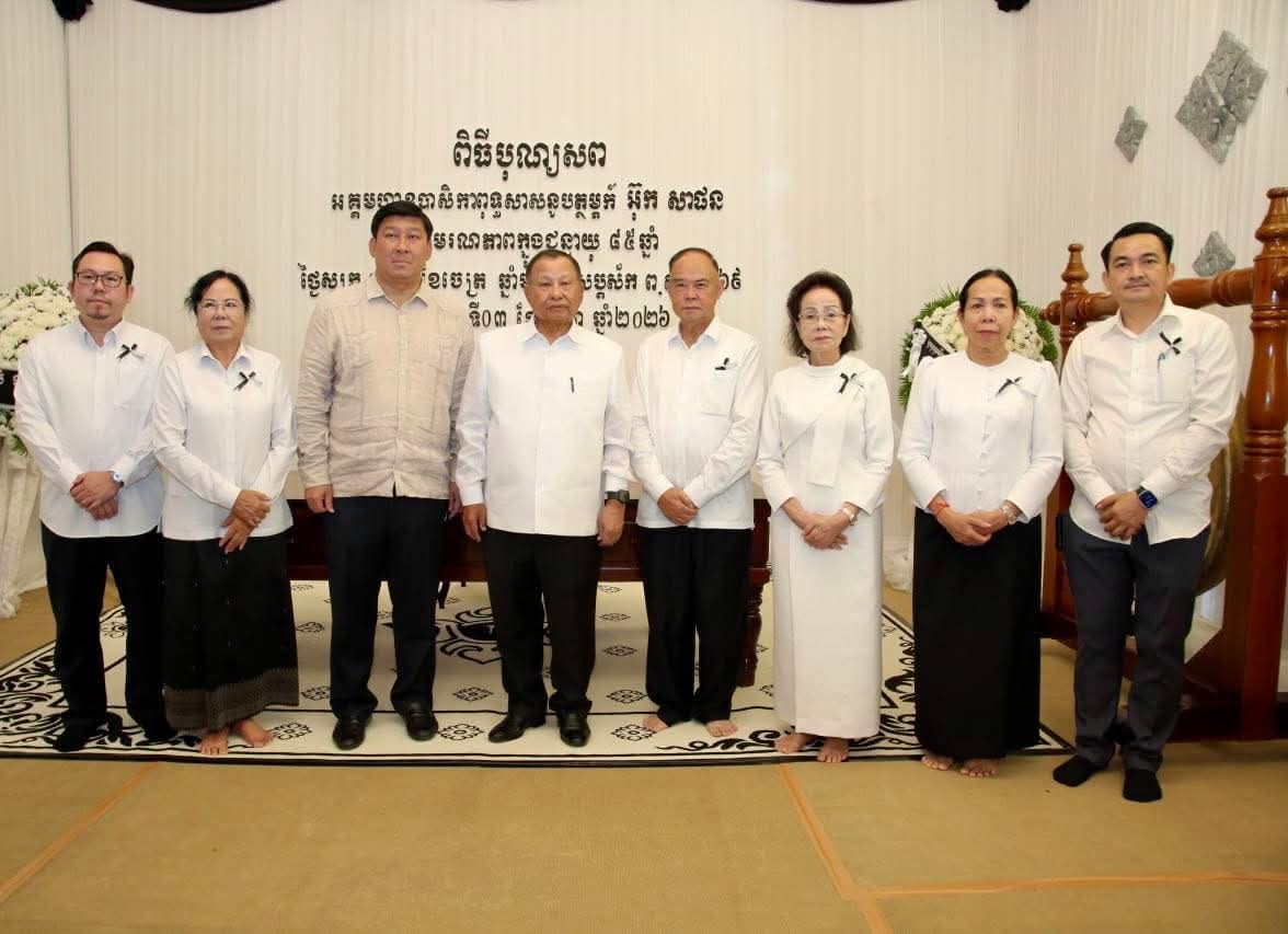 នាល្ងាចថ្ងៃ អង្គារ ៥រោច ខែ ចេត្រ ឆ្នាំម្សាញ់ សប្តស័ក ព.ស. ២៥៦៩ ត្រូវនឹងថ្ងៃទី៧ ខែមេសាឆ្នាំ២០២៦ សម្តេចវិបុលសេនាភក្តី សាយ ឈុំ ឧត្តមប្រឹក្សាផ្ទាល់ព្រះមហាក្សត្រ នៃព្រះរាជាណាចក្រកម្ពុជា បានអញ្ជើញគោរពវិញ្ញាណក្ខ័ន្ធ និងរំលែកទុក្ខ ជាមួយក្រុមគ្រួសារនៃសព អគ្គមហាឧបាសិកាពុទ្ធសាសនូបត្ថម្ភ អ៊ុក សាផន ដែលត្រូវជាបងបង្កើតរបស់លោកជំទាវបណ្ឌិត អ៊ុក ម៉ាលី ដែលបានទទួល មរណភាព កាលពីថ្ងៃសុក្រ ១រោច ខែចេត្រ ឆ្នាំម្សាញ់ សប្តស័ក ព.ស.២៥៦៩ ត្រូវនឹងថ្ងៃទី៣ ខែមេសា ឆ្នាំ២០២៦ វេលាម៉ោង ១:២២នាទីរសៀល ក្នុងជន្មាយុ ៨៥ឆ្នាំ ដោយរោគាពាធ ។