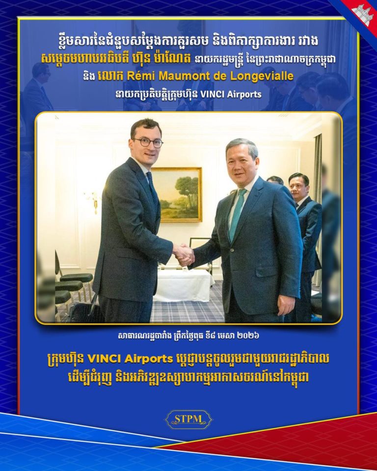 នាព្រឹកថ្ងៃទី៨ ខែមេសា ឆ្នាំ២០២៦, សម្តេចមហាបវរធិបតី ហ៊ុន ម៉ាណែត នាយករដ្ឋមន្ត្រីនៃព្រះរាជាណាចក្រកម្ពុជា បានអនុញ្ញាតឱ្យលោក Rémi Maumont de Longevialle នាយកប្រតិបត្តិក្រុមហ៊ុន VINCI Airports ចូលជួបសម្តែងការគួរសម និងពិភាក្សាការងារ ក្នុងឱកាសនៃការអញ្ជើញចូលរួមកិច្ចប្រជុំកំពូលស្តីពី «សុខភាពតែមួយ» (One Health Summit) នៅទីក្រុងលីយ៉ុង និងបំពេញទស្សនកិច្ចការងារនៅសាធារណរដ្ឋបារាំង ចាប់ពីថ្ងៃទី៦ ដល់ថ្ងៃទី៩ ខែមេសា ឆ្នាំ២០២៦។