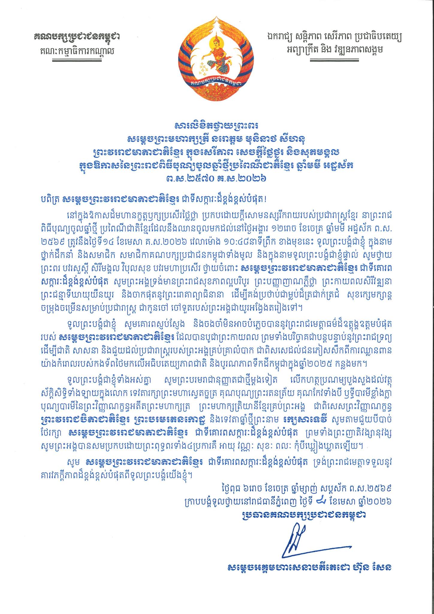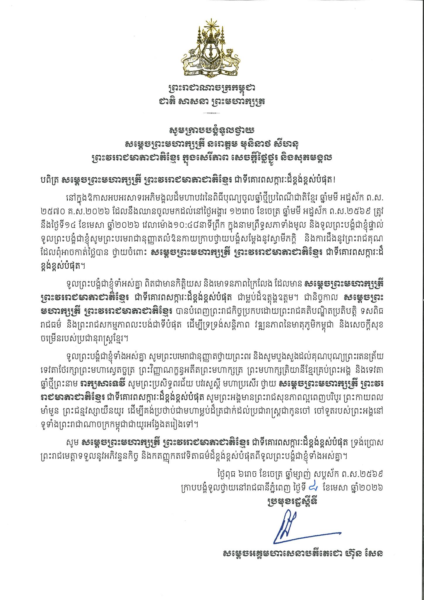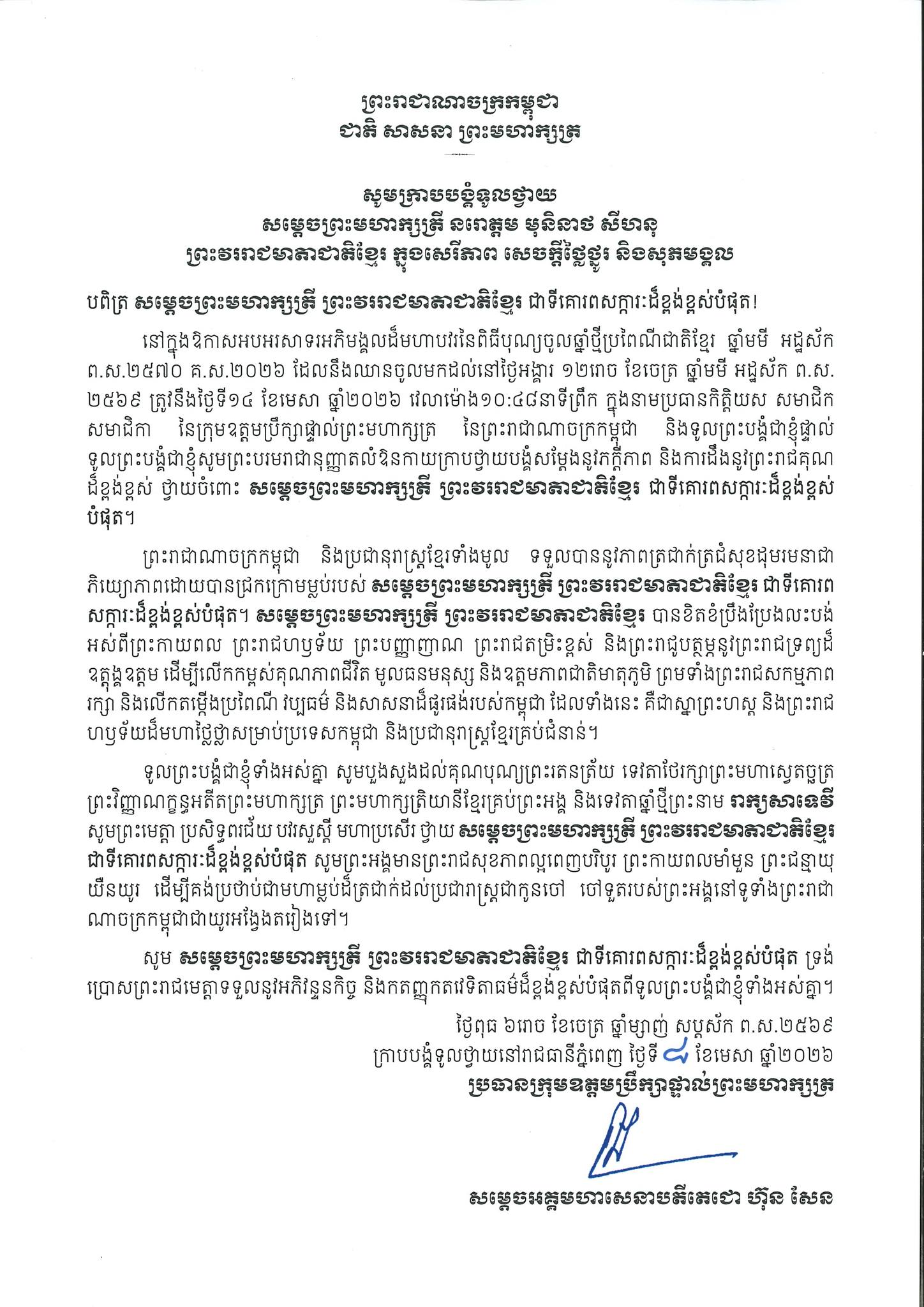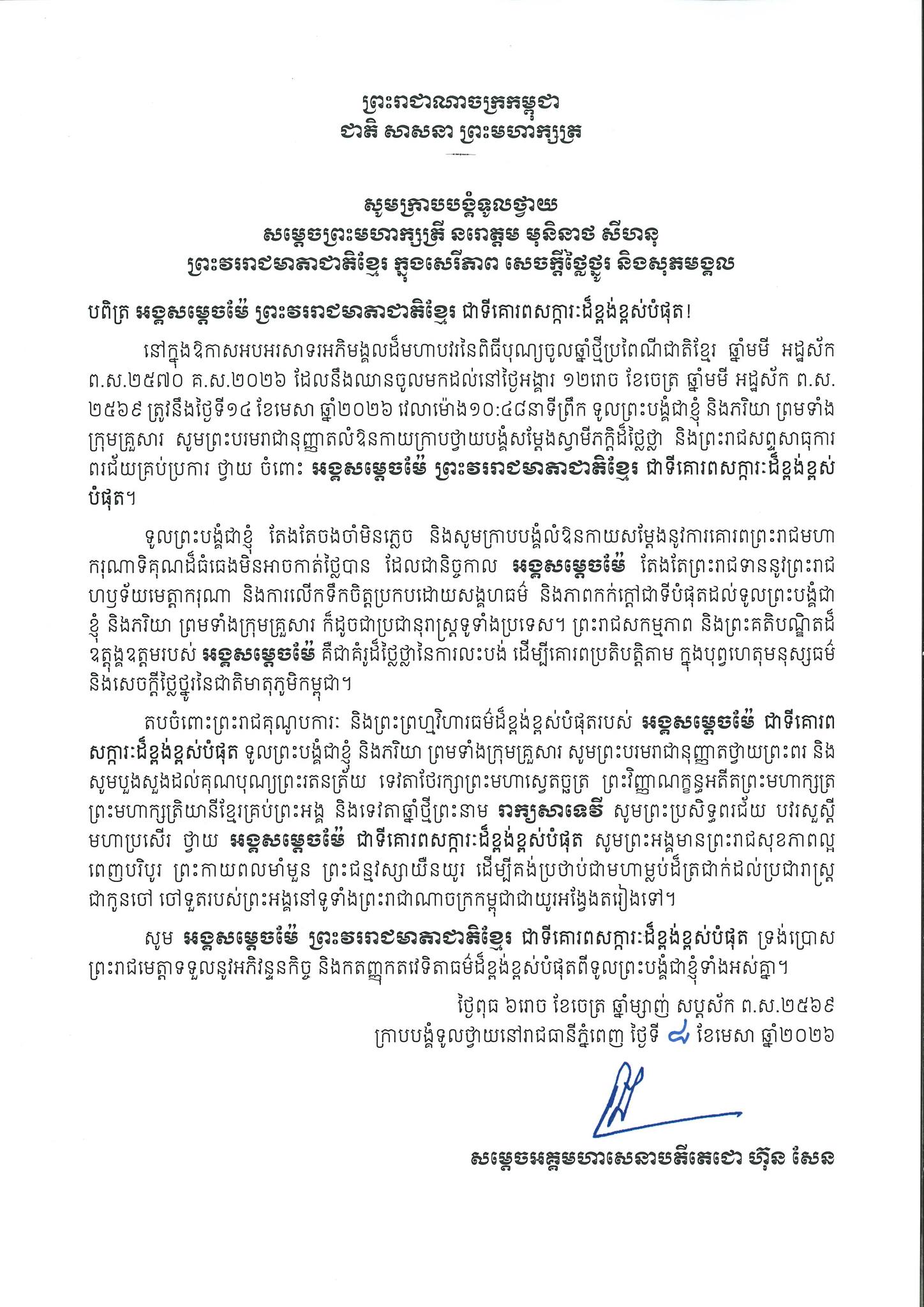 សូមក្រាបបង្គំទូលថ្វាយព្រះពរ ព្រះមហាក្សត្រី នរោត្តម មុនិនាសម្ថ សីហនុ ព្រះវររាជមាតាជាតិខ្មែរ ក្នុងសេរីភាព សេចក្តីថ្លៃថ្នូរ និងសុភមង្គល ក្នុងឱកាសពិធីបុណ្យចូលឆ្នាំថ្មីប្រពៃណីជាតិខ្មែរ ឆ្នាំមមី អដ្ឋស័ក ពុទ្ធសករាជ២៥៦៩ ឈានចូល ២៥៧០។