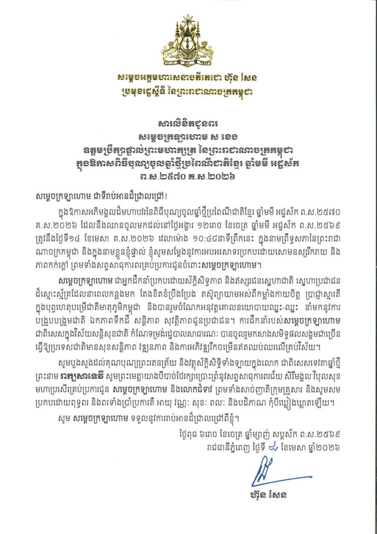 សារលិខិតជូនពរ សម្តេចអគ្គមហាសេនាបតីតេជោ ហ៊ុន សែន ប្រមុខរដ្ឋស្តីទីនៃព្រះរាជាណាចក្រកម្ពុជា និងជាប្រធានក្រុមឧត្តមប្រឹក្សាផ្ទាល់ព្រះមហាក្សត្រ ផ្ញើជូនសម្តេចក្រឡាហោម ស ខេង ឧត្តមប្រឹក្សាផ្ទាល់ព្រះមហាក្សត្រ ក្នុងឱកាសពិធីបុណ្យចូលឆ្នាំថ្មីប្រពៃណីជាតិខ្មែរ ឆ្នាំមមី អដ្ឋស័ក ពុទ្ធសករាជ ២៥៦៩ ឈានចូល ២៥៧០។