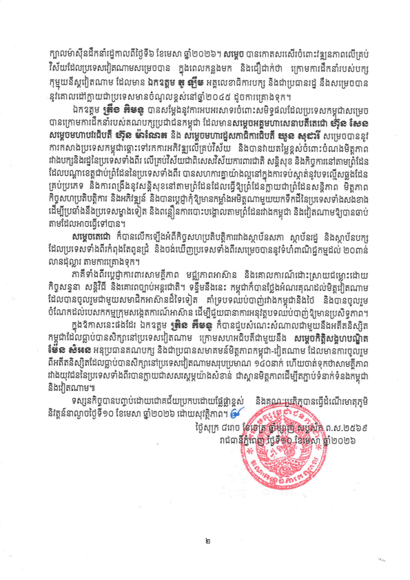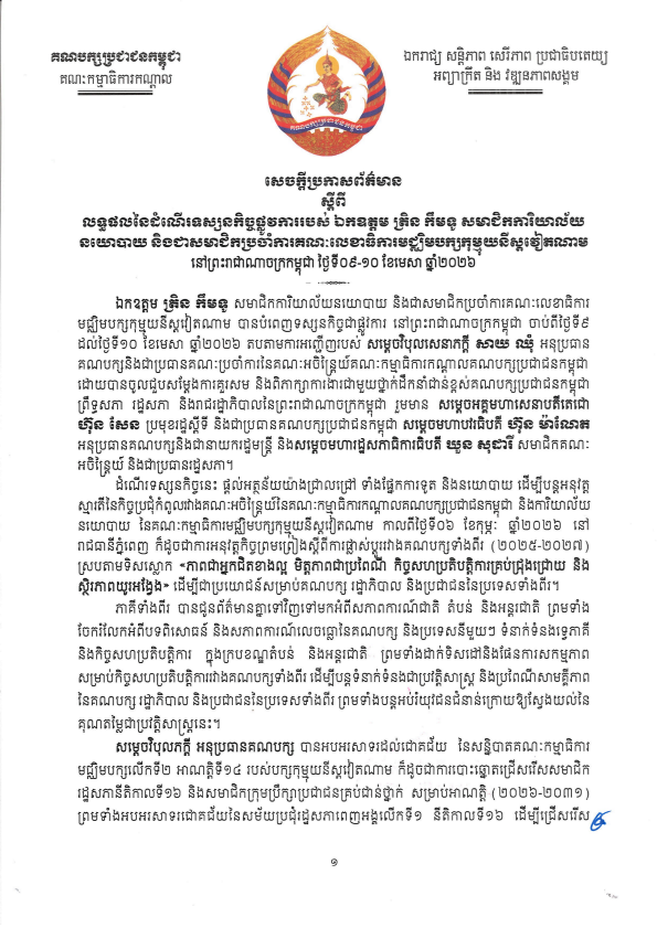 លទ្ធផលនៃដំណើរទស្សនកិច្ចផ្លូវការ របស់ ឯកឧត្តម ត្រិន កឹមទូ សមាជិកការិយាល័យនយោបាយ និងជាសមាជិកប្រចាំការគណៈលេខាធិការមជ្ឈិមបក្សកុម្មុយនីស្តវៀតណាម នៅកម្ពុជា