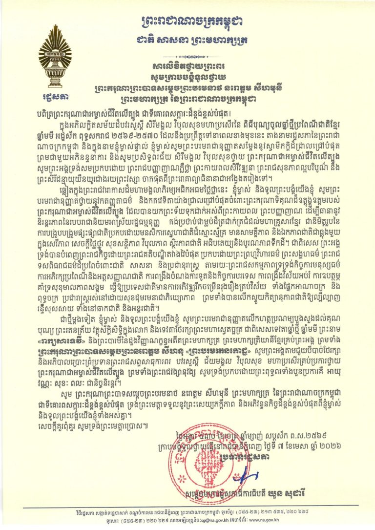សម្តេចរដ្ឋសភាធិការធិបតី ឃួន សុដារី ប្រធានរដ្ឋសភាកម្ពុជា នៅថ្ងៃទី១០ ខែមេសា ឆ្នាំ២០២៦ បានផ្ញើសារថ្វាយព្រះពរ ព្រះករុណាព្រះបាទសម្តេចព្រះ បរមនាថ នរោត្តម សីហមុនី ព្រះមហាក្សត្រនៃកម្ពុជា ជាទីគោរពសក្ការៈដ៏ខ្ពង់ខ្ពស់បំផុត ក្នុងឱកាសពិធីបុណ្យចូលឆ្នាំថ្មី ប្រពៃណីជាតិខ្មែរ ឆ្នាំមមី អដ្ឋស័ក ពុទ្ធសករាជ ២៥៦៩-២៥៧០ គ.ស ២០២៦។