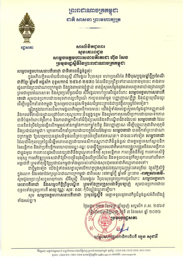 សម្តេចរដ្ឋសភាធិការធិបតី ឃួន សុដារី ប្រធានរដ្ឋសភាកម្ពុជា នៅថ្ងៃទី១០ ខែមេសា ឆ្នាំ២០២៦ បានផ្ញើសារលិខិតគោរពជូនពរ សម្តេចអគ្គមហាសេនាបតីតេជោ ហ៊ុន សែន ប្រមុខរដ្ឋស្តីទីនៃព្រះរាជាណាចក្រកម្ពុជា ក្នុងឱកាសពិធីបុណ្យចូលឆ្នាំថ្មី ប្រពៃណីជាតិខ្មែរ ឆ្នាំមមី អដ្ឋស័ក ពុទ្ធសករាជ ២៥៦៩-២៥៧០ គ.ស ២០២៦។