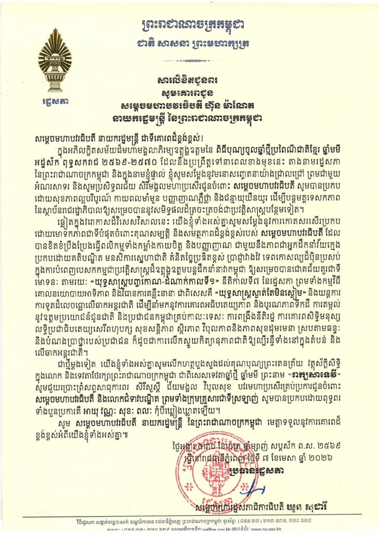 សម្តេចរដ្ឋសភាធិការធិបតី ឃួន សុដារី ប្រធានរដ្ឋសភាកម្ពុជា នៅថ្ងៃទី១០ ខែមេសា ឆ្នាំ២០២៦ បានផ្ញើសារលិខិតគោរពជូនពរ សម្តេចមហាបវរធិបតី ហ៊ុន ម៉ាណែត នាយករដ្ឋមន្ត្រី នៃព្រះរាជាណាចក្រកម្ពុជា ក្នុងឱកាសពិធីបុណ្យចូលឆ្នាំថ្មី ប្រពៃណីជាតិខ្មែរ ឆ្នាំមមី អដ្ឋស័ក ពុទ្ធសករាជ ២៥៦៩-២៥៧០ គ.ស ២០២៦។