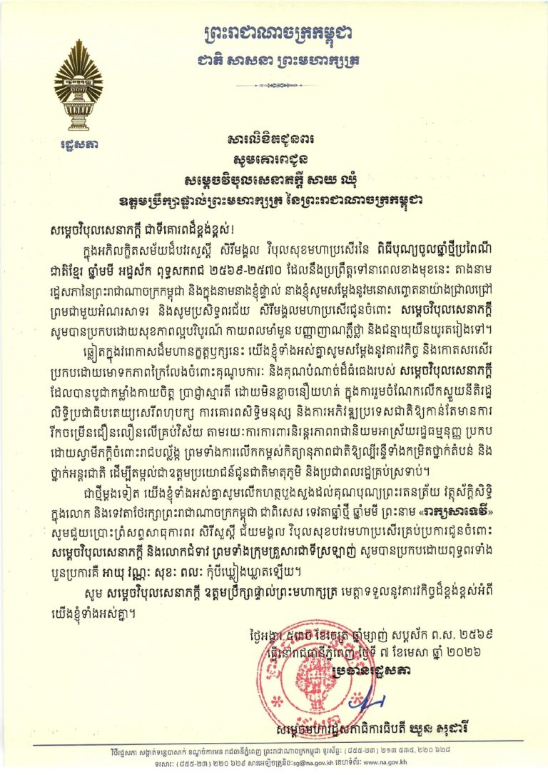 សម្តេចរដ្ឋសភាធិការធិបតី ឃួន សុដារី ប្រធានរដ្ឋសភាកម្ពុជា នៅថ្ងៃទី១០ ខែមេសា ឆ្នាំ២០២៦ បានផ្ញើសារលិខិតគោរពជូនពរ សម្តេចវិបុលសេនាភក្តី សាយ ឈុំ ឧត្តមប្រឹក្សាផ្ទាល់ព្រះមហាក្សត្រ នៃព្រះរាជាណាចក្រកម្ពុជា ក្នុងឱកាសពិធីបុណ្យចូលឆ្នាំថ្មី ប្រពៃណីជាតិខ្មែរ ឆ្នាំមមី អដ្ឋស័ក ពុទ្ធសករាជ ២៥៦៩-២៥៧០ គ.ស ២០២៦។