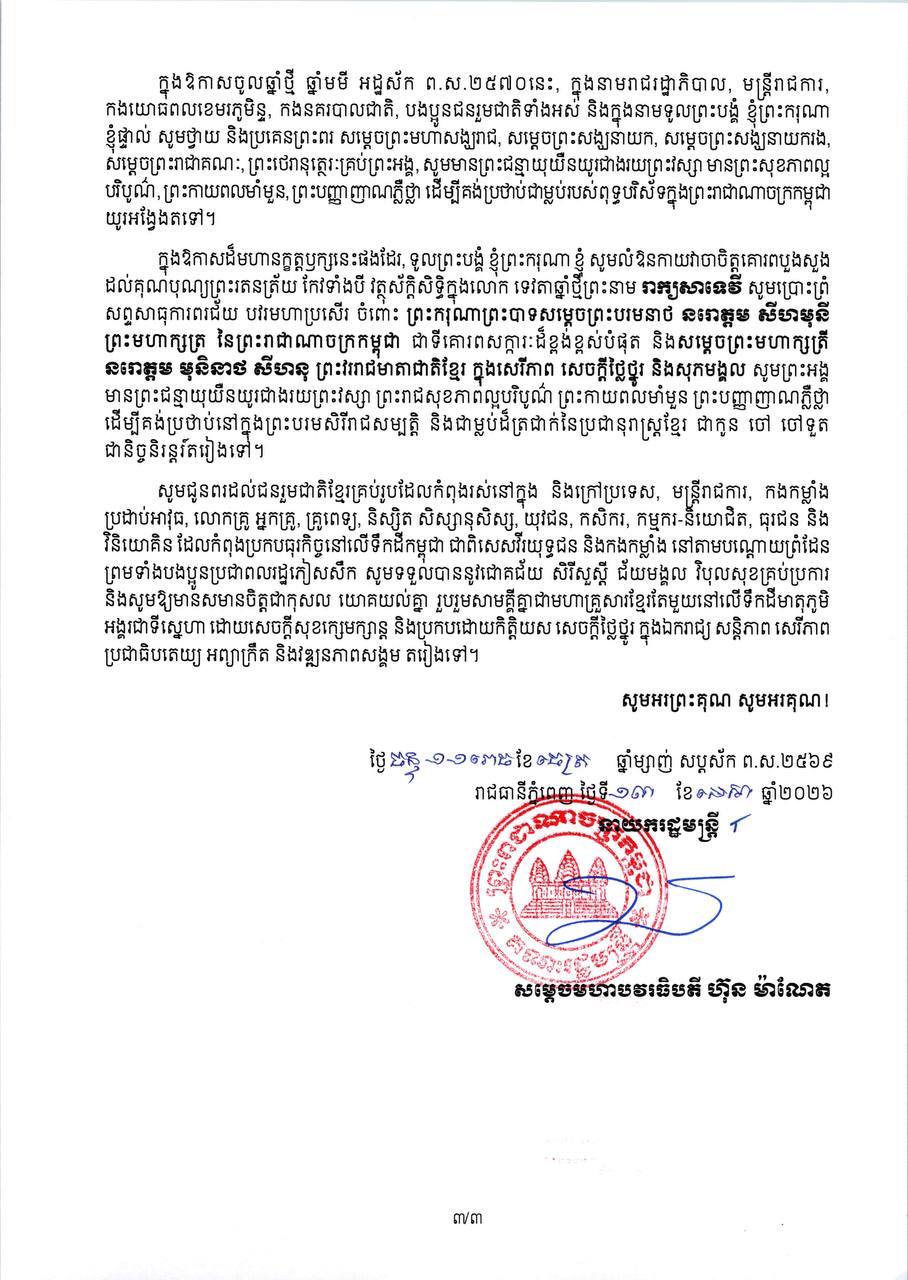 តាមរយៈសារលិខិត សម្តេចបវរធិបតី ហ៊ុន ម៉ាណែត សូមសម្តែងនូវការអបអរសាទរ និងចូលរួមប្រារព្ធពិធីបុណ្យប្រពៃណីជាតិខ្មែរដ៏សំខាន់នេះជាមួយបងប្អូនជនរួមជាតិទាំងអស់ដែលកំពុងរស់នៅក្នុង និងក្រៅប្រទេស ស្របតាមលមានគន្លងព្រះពុទ្ធសាសនា និងទំនៀមទម្លាប់ដូនតាដ៏ល្អផូរផង់នៃយើង។ ឆ្នាំនេះ គឺជាឆ្នាំទី៣ នៃអាណត្តិរបស់រាជរដ្ឋាភិបាល នីតិកាលទី៧ នៃរដ្ឋសភា ដែលបាននិងកំពុងបន្តយ៉ាងស្វាហាប់ និងប្រកបដោយការទទួលខុសត្រូវខ្ពស់ ក្នុងការរក្សាសុខសន្តិភាព, ការឯកភាពជាតិ និងសាមគ្គីភាពជាតិរឹងមាំ ដើម្បីបន្តរក្សាឱ្យបាននូវ ស្ថិរភាពនយោបាយ, សន្តិសុខ, សណ្តាប់ធ្នាប់សាធារណៈ និងស្ថិរភាពម៉ាក្រូសេដ្ឋកិច្ច ព្រមទាំងសុខុមាលភាពប្រជាជន, សេចក្តីថ្លៃថ្នូរ និងវឌ្ឍនភាពសង្គម។