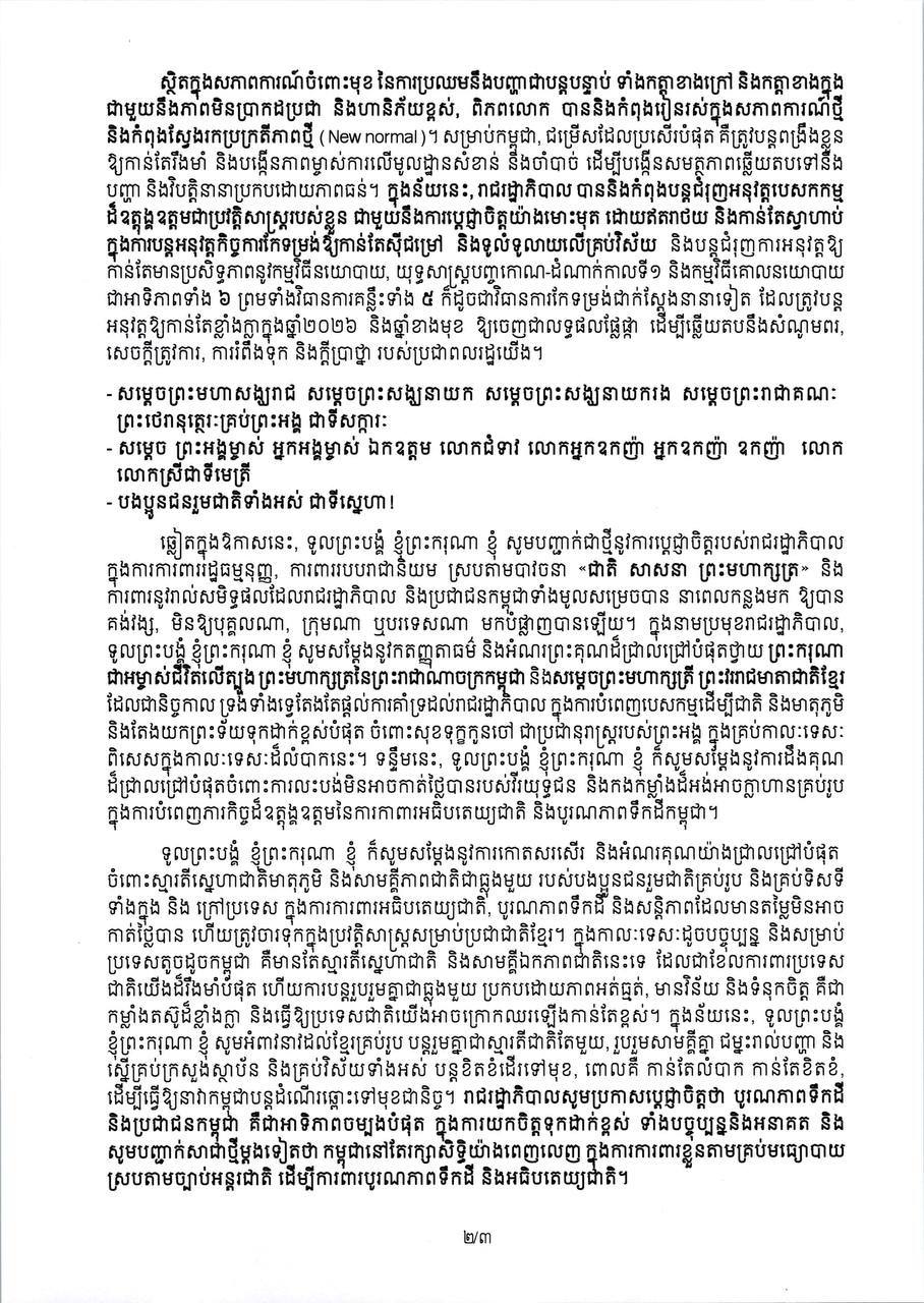 ក្នុងនាមរាជរដ្ឋាភិបាល សម្តេចបវរធិបតី ហ៊ុន ម៉ាណែត សូមបញ្ជាក់អំពីការប្តេជ្ញាចិត្តខ្ពស់ក្នុងការបន្តខិតខំប្រឹងប្រែងកសាង ការពារ និងអភិវឌ្ឍសង្គមជាតិ ឈរលើមាគ៌ាដ៏ត្រឹមត្រូវឆ្ពោះទៅរកភាពសុខដុមរមនា, សេចក្តីថ្លៃថ្នូរ និងសុខុមាលភាពសង្គម បើទោះជាត្រូវជួបប្រទះឧបសគ្គ និងបញ្ហាប្រឈម យ៉ាងណាក៏ដោយ។ យើងត្រូវតែប្រែក្លាយការលំបាកទាំងនេះឱ្យទៅជាបទពិសោធន៍ ប្រែក្លាយការឈឺចាប់ឱ្យទៅជាថាមពលដ៏រឹងមាំ និងប្រែក្លាយឧបសគ្គ ឱ្យទៅជាឱកាសដើម្បីជោគជ័យ។ ពិតណាស់ថា ក្នុងឆ្នាំកន្លងទៅ យើងបានឆ្លងកាត់នូវវិញ្ញាសាដ៏លំបាក និងថ្មីៗ ជាច្រើនមិនធ្លាប់មានដែលបាននិងកំពុងបង្កើតជាផលប៉ះពាល់ដោយផ្ទាល់ និងដោយប្រយោលមកលើសន្តិសុខ និងសង្គម-សេដ្ឋកិច្ចជាតិយើង៕