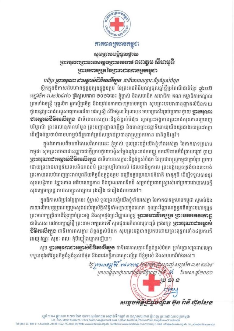 ទូលព្រះបង្គំជាខ្ញុំ និងសមាជិក-សមាជិកា គណៈកម្មាធិការកណ្ដាល ព្រមទាំងមន្ដ្រី បុគ្គលិក អ្នកស្ម័គ្រចិត្ដ និងយុវជនកាកបាទក្រហមកម្ពុជា សូមព្រះបរមរាជានុញ្ញាតសម្តែងនូវសេចក្ដីអំណរសាទរឥតឧបមាថ្វាយព្រះសព្ទសាធុការពរជ័យ បវរសួស្តី សិរីវឌ្ឍនា មហាប្រសើរគ្រប់យ៉ាង នៅក្នុងឱកាសដ៏មហាប្រសើរថ្លៃថ្លាជយាភិរម្យ ប្រកបដោយក្តីសោមនស្សរីករាយ នៃព្រះរាជពិធីបុណ្យចូលឆ្នាំប្រពៃណីជាតិខ្មែរ ឆ្នាំមមី អដ្ឋស័ក ពុទ្ធសករាជ ២៥៦៩ ត្រូវនឹងថ្ងៃទី ១៤-១៥-១៦ ខែមេសា ឆ្នាំ២០២៦ សូមព្រះអង្គទ្រង់ប្រកបដោយព្រះកាយពលរឹងមាំខ្លាំងក្លា ព្រះបញ្ញាញាណភ្លឺថ្លាត្រចះត្រចង់ ព្រះរាជសុខភាពល្អបរិបូរណ៍ ព្រះជន្មាយុយឺនយូរជាងរយព្រះវស្សា ចាកផុតពីព្រះរោគាព្យាធិ ដើម្បីព្រះអង្គទ្រង់គង់ប្រថាប់នៅក្នុងព្រះបរមសិរីរាជសម្បត្តិ ជាព្រះម្លប់ដ៏ត្រជាក់ត្រជុំ សម្បូរសប្បាយ ចម្រុងចម្រើន ថ្កុំថ្កើងរុងរឿងរបស់មាតុភូមិកម្ពុជាជាទីស្នេហា និងប្រជានុរាស្ត្រ ដើម្បីបន្តព្រះរាជបេសកកម្មដ៏ឧត្តុង្គឧត្តម។