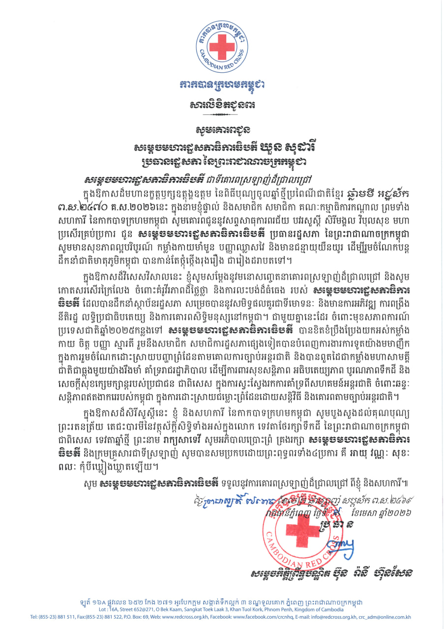 ក្នុងឱកាសដ៏សិរីសួស្តីនេះ យើងខ្ញុំនិងសហការី នៃកាកបាទក្រហមកម្ពុជា សូមបួងសួងដល់គុណបុណ្យ ព្រះរតនត្រ័យ តេជះបារមីនៃវត្ថុស័ក្តិសិទ្ធិទាំងអស់ក្នុងលោក ទេវតាថែរក្សាទឹកដី នៃព្រះរាជាណាចក្រកម្ពុជា ជាពិសេស ទេវតាឆ្នាំថ្មី ព្រះនាម «រាក្យសាទេវី» សូមអភិបាលប្រោះព្រំ គ្រងរក្សា សម្តេចមហារដ្ឋសភាធិការ ធិបតី និងក្រុមគ្រួសារជាទីស្រឡាញ់ សូមបានសមប្រកបដោយព្រះពុទ្ធពរទាំង៤ប្រការ គឺ អាយុ វណ្ណៈ សុខៈ ពលៈ កុំបីឃ្លៀងឃ្លាតឡើយ៕
