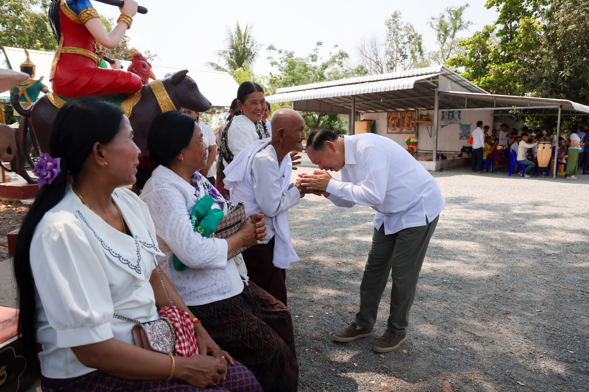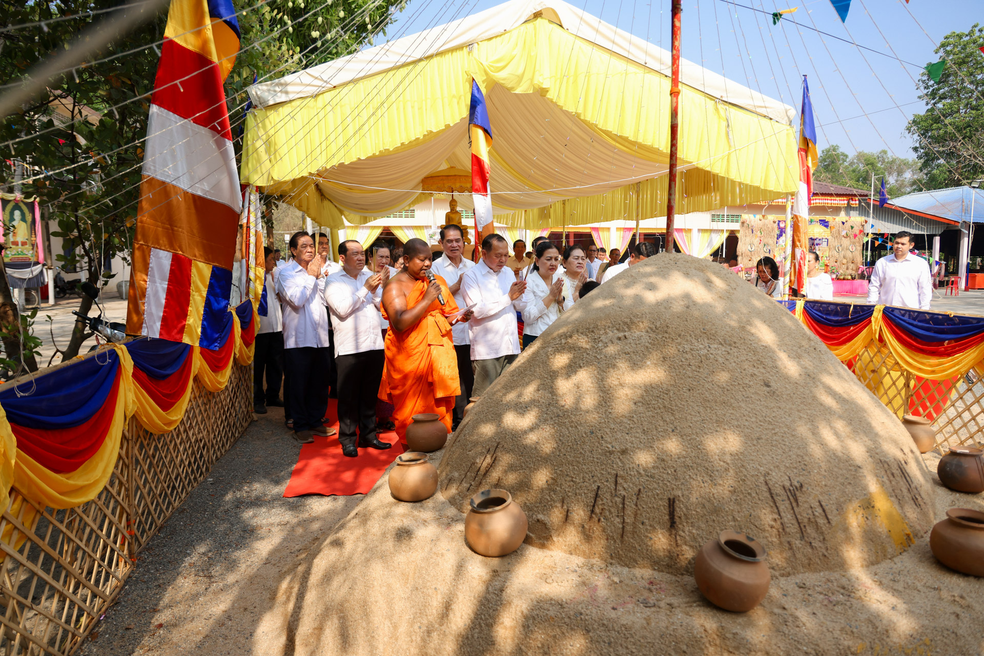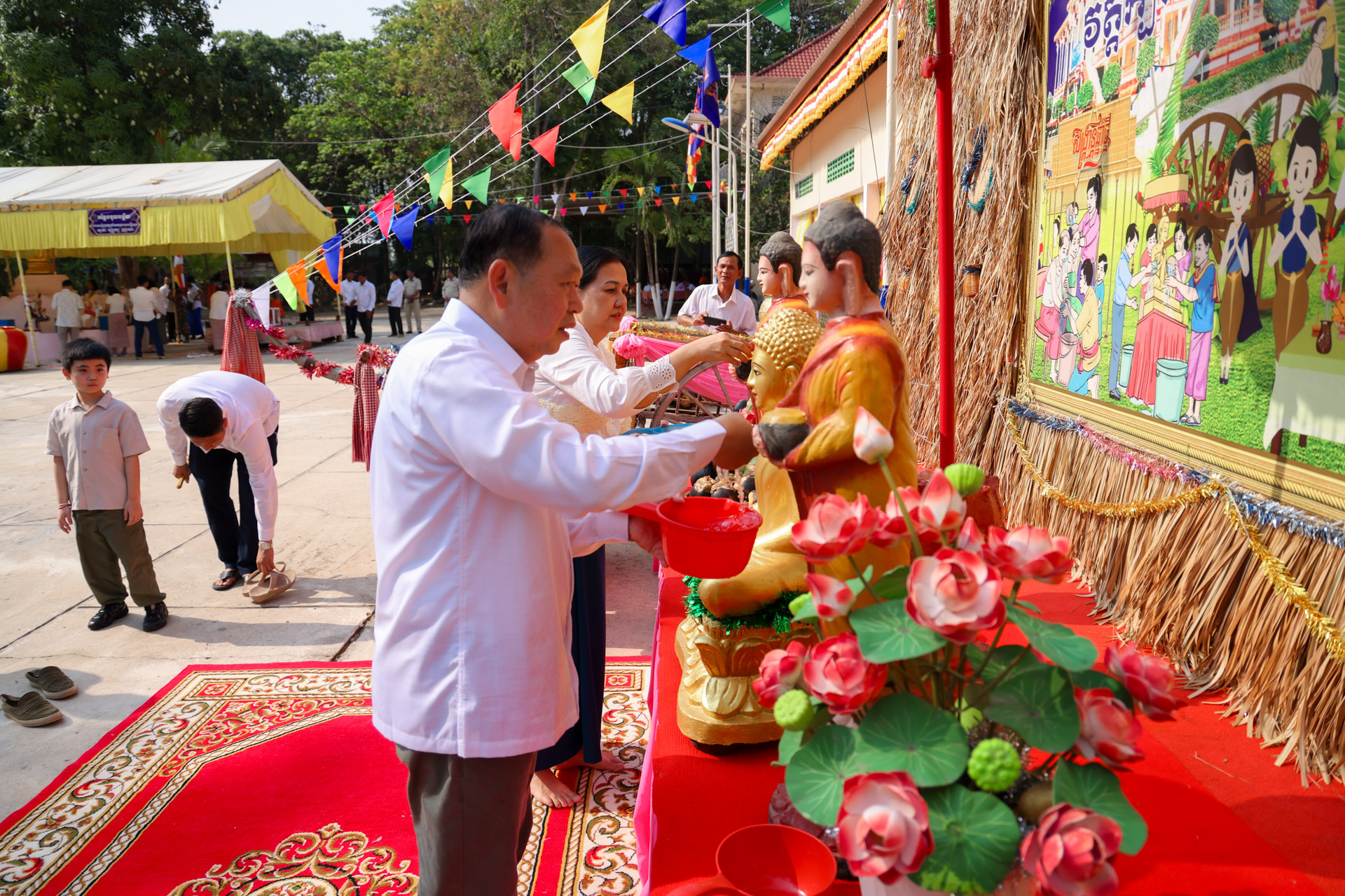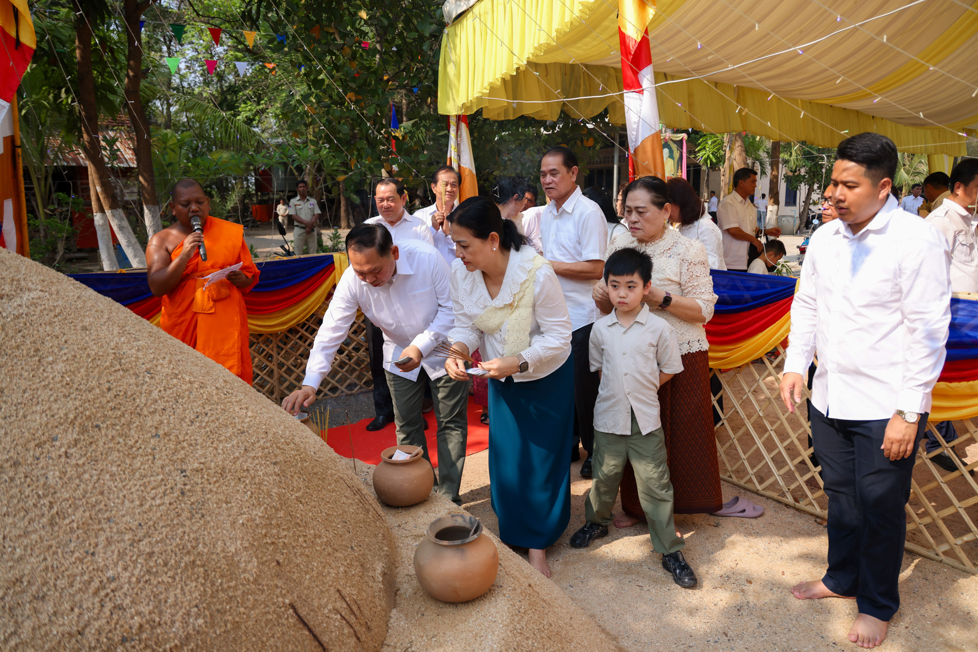 ក្នុងឱកាសនោះ ឯកឧត្តមរដ្ឋមន្ដ្រី និងលោកស្រីព្រមទាំងគណៈប្រតិភូរួមដំណើរ បានអញ្ជើញបង្សុកូល និងរាប់បាត្រ ដើម្បីឧទ្ទិសកុសលជូនដល់បុព្វការីជន មាតាបិតា ជីដូនជីតា និងញាតកាទាំង៧សន្ដាន ដែលបានចែកឋានទៅកាន់បរលោកខាងមុខ ក៏ដូចជាវីរកងទ័ព វីរនគរបាល ដែលបានពលីជីវិតក្នុងបុព្វហេតុការពារជាតិមាតុភូមិ។ បន្ទាប់មក ឯកឧត្តមរដ្ឋមន្ដ្រី និងគណៈប្រតិភូ បានអញ្ជើញប្រទក្សិណជុំវិញវាលុកចេតិយ (ពូនភ្នំខ្សាច់) ដើម្បីឧទ្ទិសដល់ព្រះមុនីចេតិយរបស់ព្រះសម្មាសម្ពុទ្ធនិង និងរំដោះកម្មពៀរវេរាទាំងឡាយ ព្រមទាំងស្រង់ព្រះសុគន្ធវារីថ្វាយព្រះពុទ្ធប្បដិមា ដើម្បីលាងជម្រះនូវបាបកម្មទាំងឡាយនិងទទួលពរជ័យសិរីសួស្តីក្នុងឆ្នាំថ្មី ជាពិសេសសុំសេចក្តីសុខ សេចក្តីចម្រើន ត្រជាក់ត្រជំនៅក្នុងក្រុមមគ្រួសារ និងសង្គមជាតិទាំងមូល។