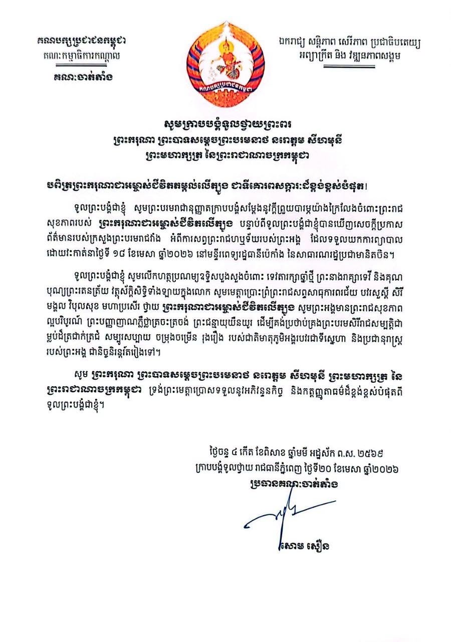 ឯកឧត្តម សោម សឿន សមាជិកគណៈអចិន្ត្រៃយ៍ និងជាប្រធានគណៈចាត់តាំង ក្រាបបង្គំទូលថ្វាយសារលិខិតថ្វាយព្រះពរ ព្រះករុណាព្រះបាទសម្តេចព្រះបរមនាថ នរោត្តម សីហមុនី ព្រះមហាក្សត្រ នៃព្រះរាជាណាចក្រកម្ពុជា ជាទីគោរពសក្ការៈដ៏ខ្ពង់ខ្ពស់បំផុត Posted on ថ្ងៃចន្ទ, 20 ខែមេសា, 2026ថ្ងៃចន្ទ, 20 ខែមេសា, 2026 អត្ថបទដោយ Sovann