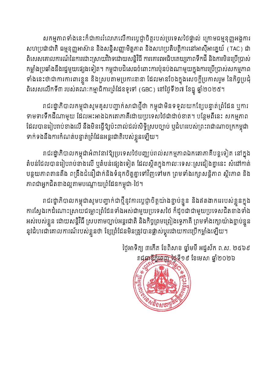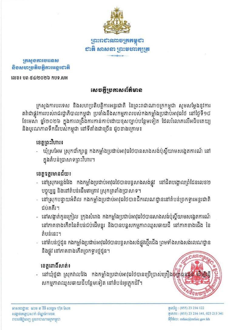 ក្នុងសេចក្ដីប្រកាសព័ត៌មាន នៅថ្ងៃទី១៩ ខែមេសា ឆ្នាំ២០២៦នេះ ក្រសួងការបរទេស និងសហប្រតិបត្តិការអន្ដរជាតិ បានឲ្យដឹងថា កងកម្លាំងប្រដាប់អាវុធថៃ ពង្រឹងការកាន់កាប់ដោយខុសច្បាប់បន្ថែមទៀត ដែលរំលោភលើអធិបតេយ្យ និងបូរណភាពទឹកដីរបស់កម្ពុជានៅទីតាំងជាច្រើន ដូចខាងក្រោម៖