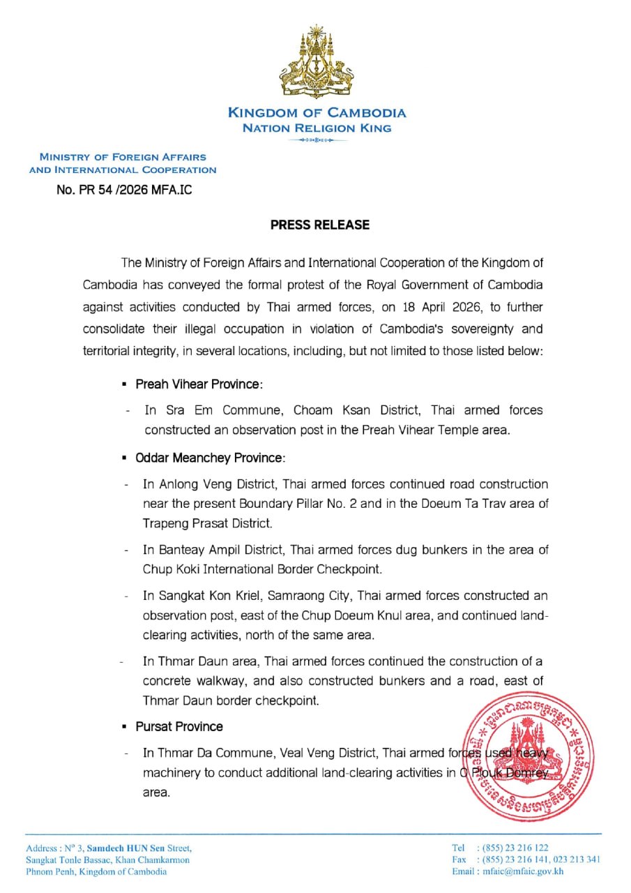 ក្រសួងការបរទេស និងសហប្រតិបត្តិការអន្តរជាតិ នៃព្រះរាជាណាចក្រកម្ពុជា ចេញសេចក្តីប្រកាសព័ត៌មាន តវ៉ាជាផ្លូវការរបស់រាជរដ្ឋាភិបាលកម្ពុជា ប្រឆាំងនឹងសកម្មភាពរបស់កងកម្លាំងប្រដាប់អាវុធថៃ នៅថ្ងៃទី១៨ ខែមេសា ឆ្នាំ២០២៦ ក្នុងការពង្រឹងការកាន់កាប់ដោយខុសច្បាប់បន្ថែមទៀត ដែលរំលោភលើអធិបតេយ្យ និងបូរណភាពទឹកដីរបស់កម្ពុជា។