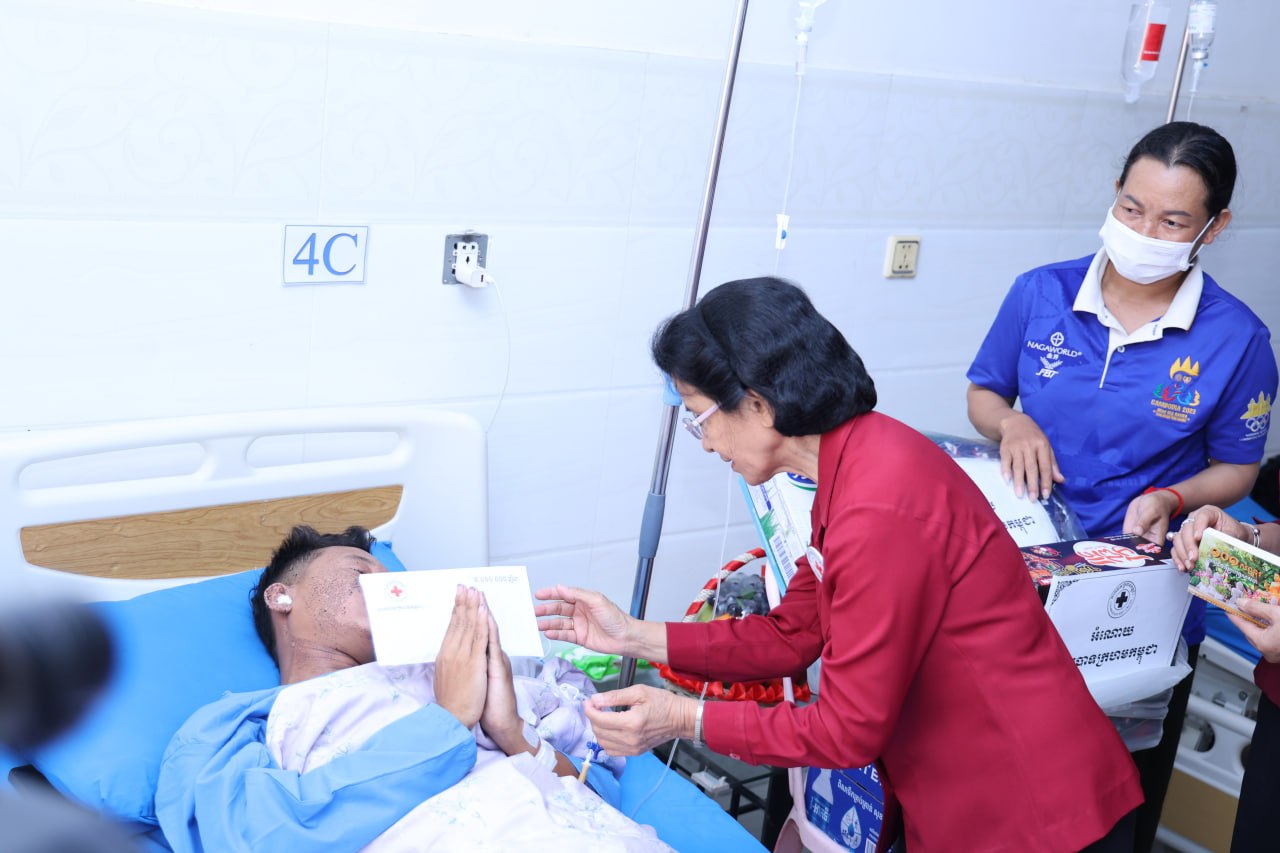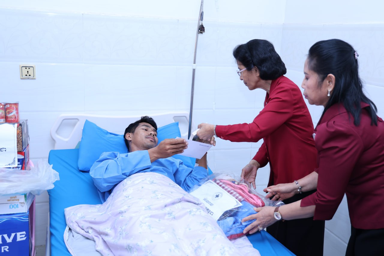 ក្នុងឱកាសចុះសួរសុខទក្ខ យោធិននាពេលនេះ លោកជំទាវអគ្គលេខាធិការ បាននាំនូវព្រះរាជបណ្តាំផ្តាំផ្ញើសួរសុខទុក្ខ ព្រះទ័យអាណិតអាសូរ ពីសំណាក់ សម្តេចព្រះមហាក្សត្រី ព្រះវររាជមាតាជាតិខ្មែរ ជាទីគោរពសក្ការៈ ដ៏ខ្ពង់ខ្ពស់បំផុត និងការផ្តាំផ្ញើសួរសុខទុក្ខពីសម្តេចកិត្តិព្រឹទ្ធបណ្ឌិត ប៊ុន រ៉ានី ហ៊ុនសែន ជូនចំពោះយោធិនមានជំងឺទាំងអស់ ជាពិសេសបានកោតសរសើរស្ញប់ស្ញែង ចំពោះទឹកចិត្តដ៏អង់អាច របស់បងប្អូនយោធិនដែលបានលះបង់គ្រប់បែបយ៉ាង ក្នុងបុព្វហេតុជាតិ មាតុភូមិ និងសូមជូនពរ យោធិនគ្រប់រូប ឆាប់បានជាសះស្បើយនិងវិលត្រប់ទៅបំពេញភារកិច្ចឡើងវិញ។