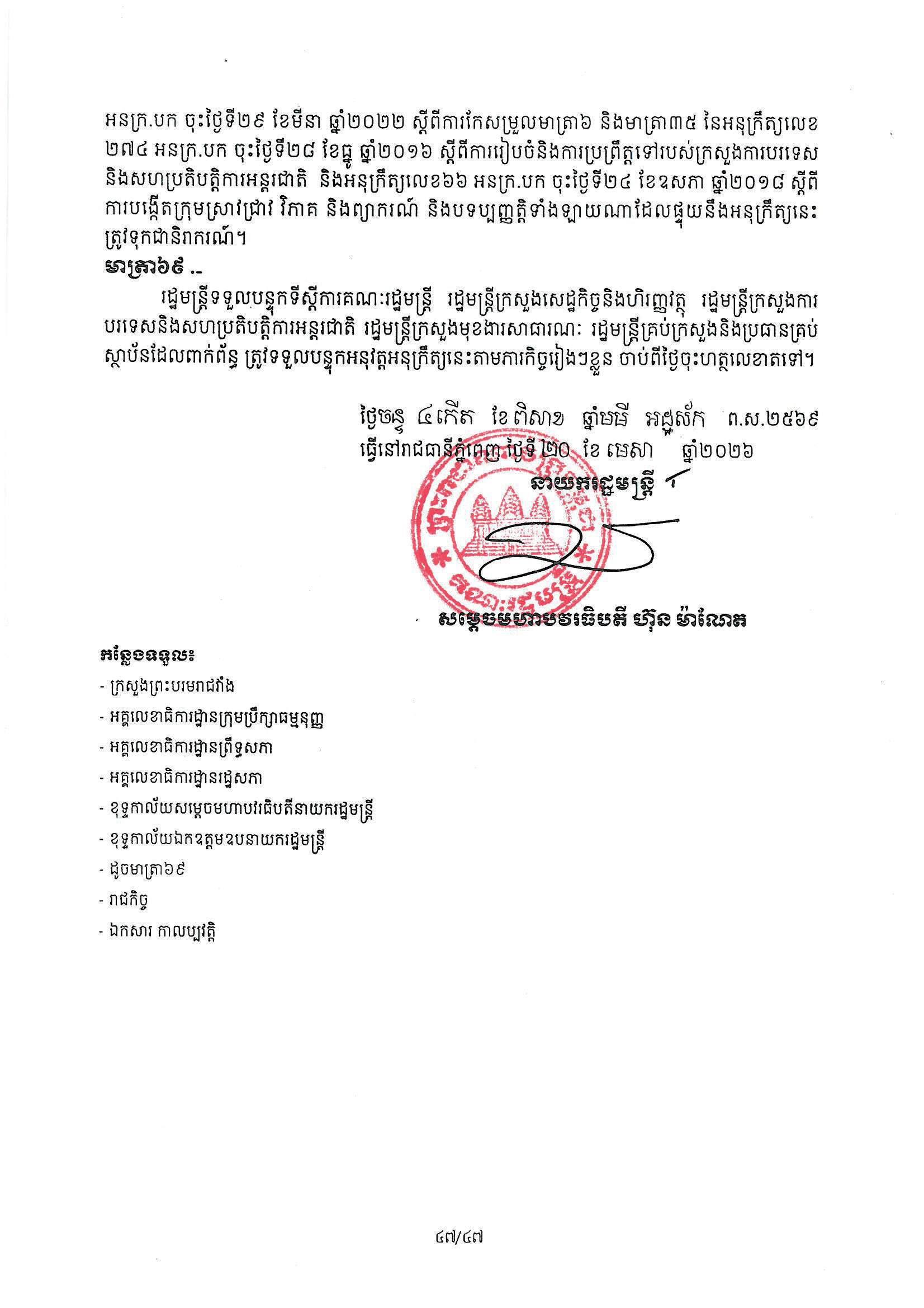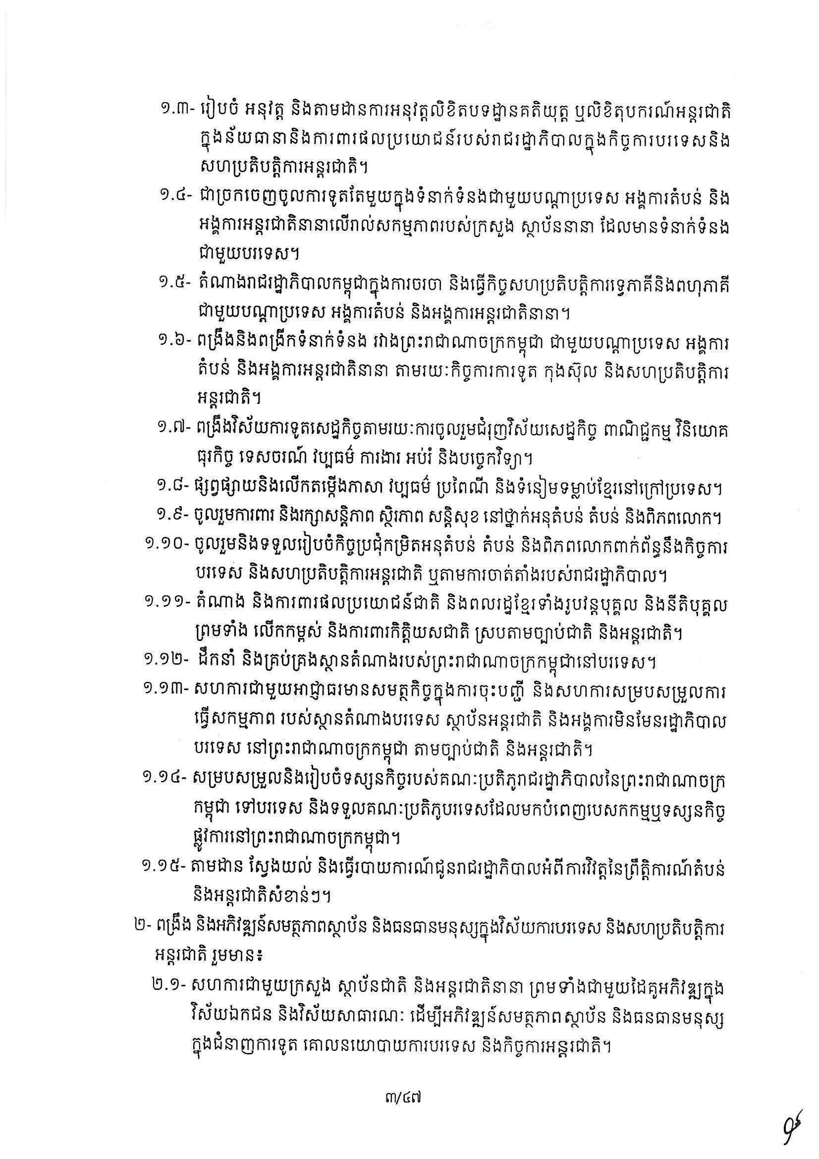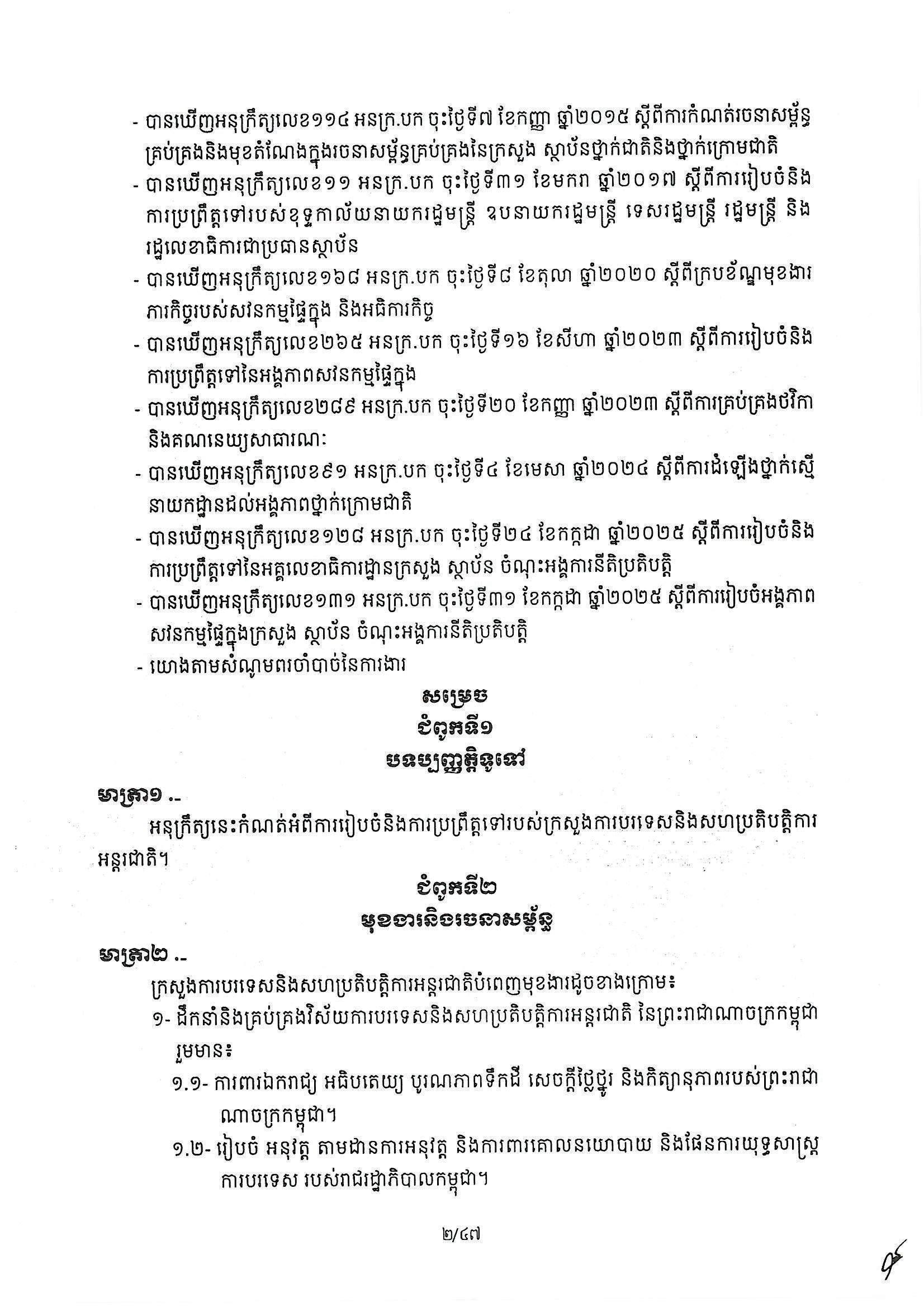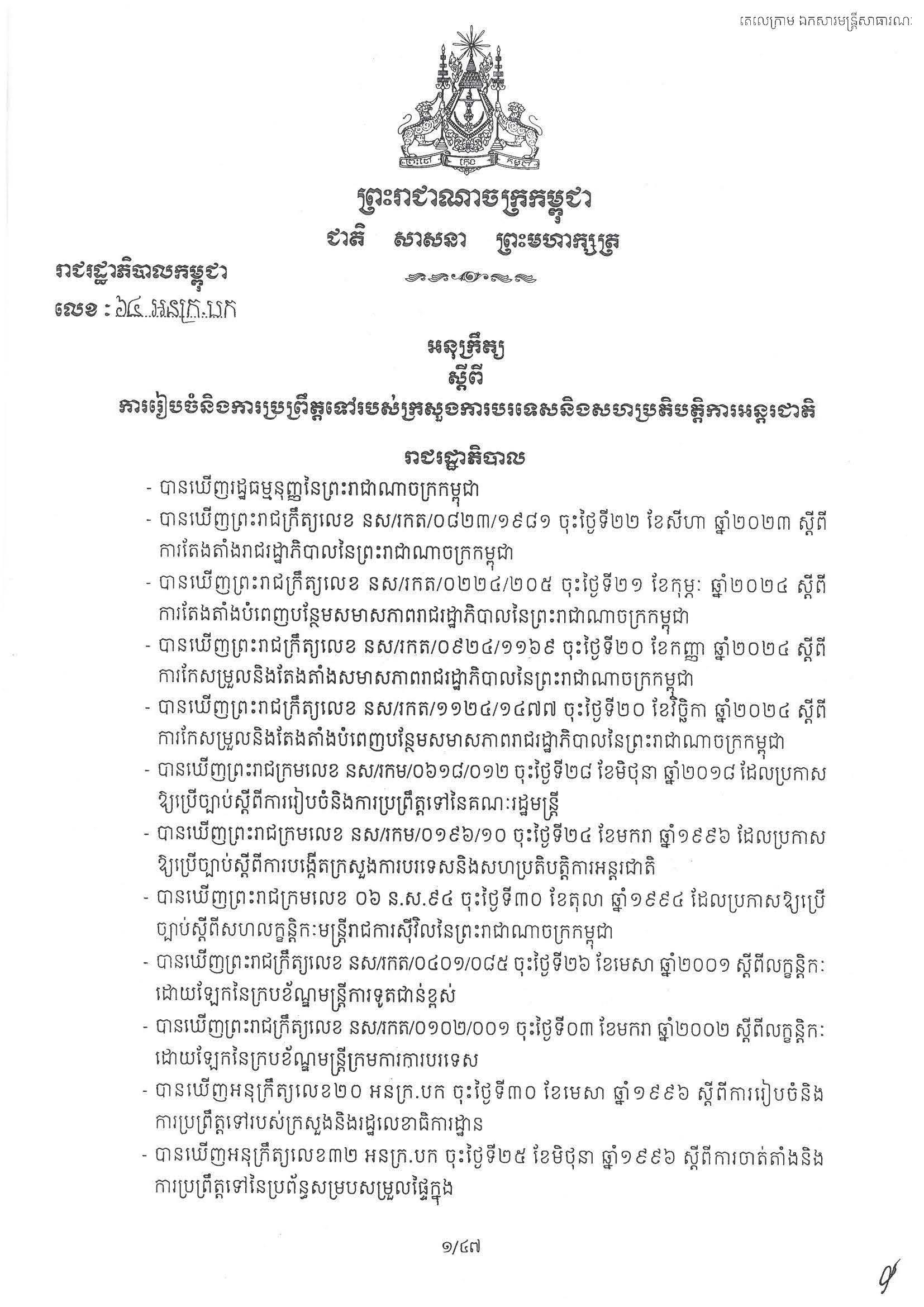 សម្តេចធិបតី ហ៊ុន ម៉ាណែត នាយករដ្ឋមន្ត្រីកម្ពុជា បានចេញអនុក្រឹត្យ ស្ដីពីការរៀបចំ និងការប្រព្រឹត្តទៅរបស់ក្រសួងការបរទេស និងសហប្រតិបត្តិការអន្តជាតិ។