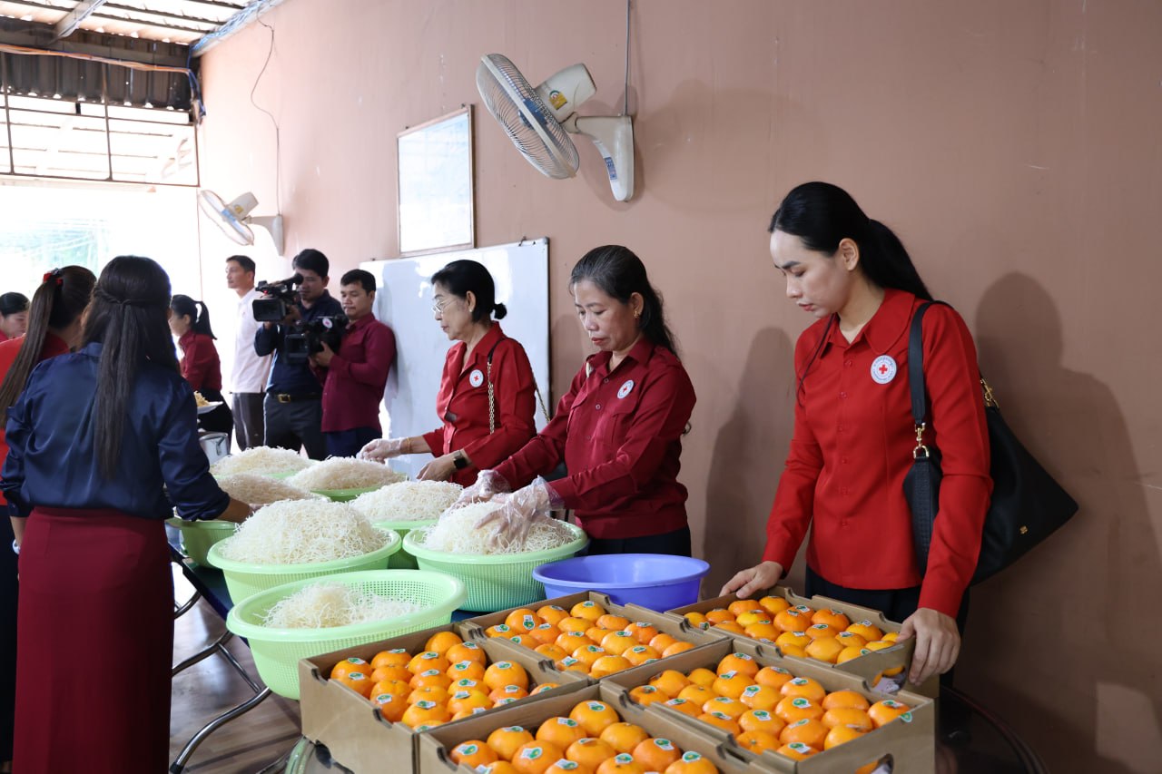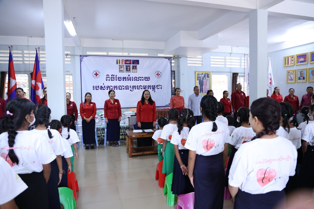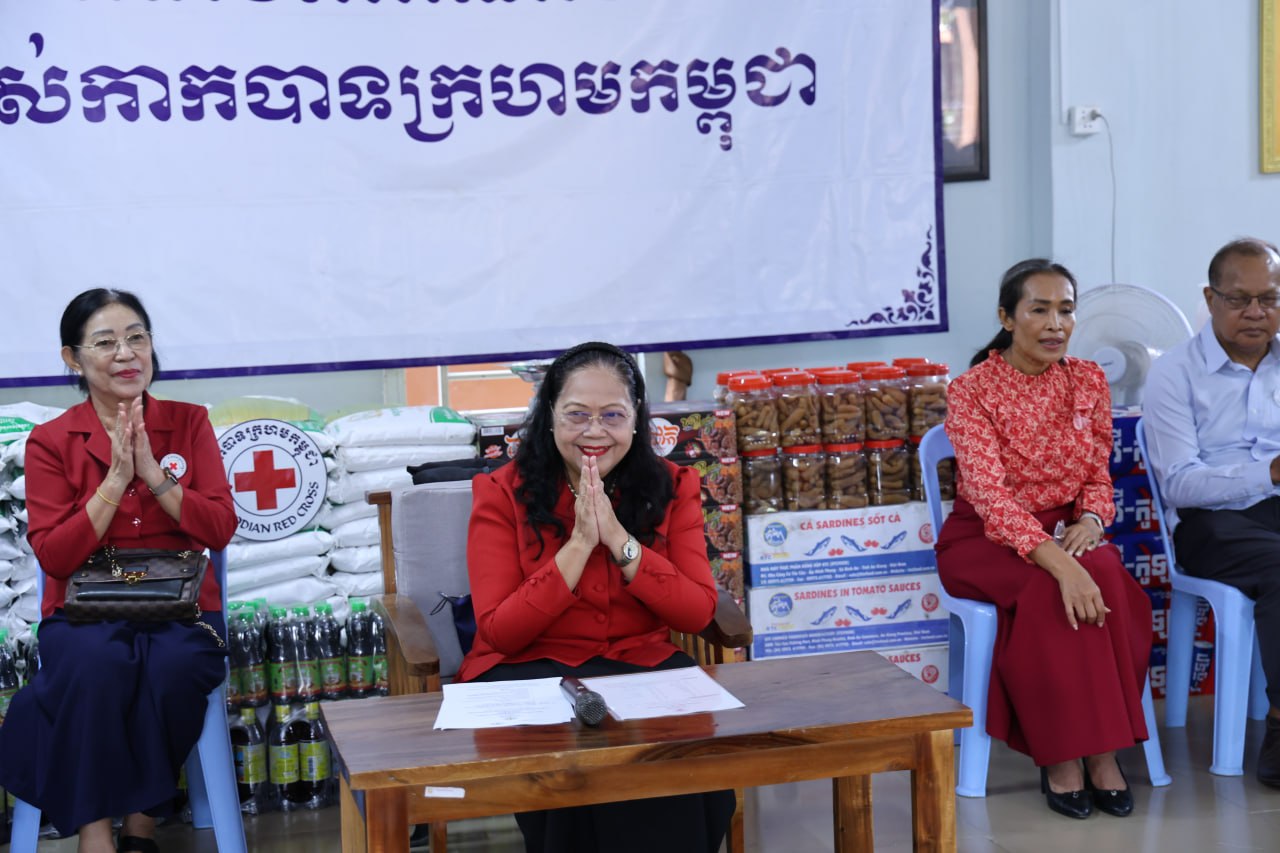 លោកជំទាវបានបន្តថា ដើម្បីជួយសម្រាលការលំបាក និងគាំទ្រដល់ការហូបចុក កាកបាទក្រហមកម្ពុជាបានផ្ដល់ជូននូវគ្រឿងឧបភោគបរិភោគ៖ អង្ករ ២តោន, អង្ករសុខភាព ១០កេស, មី ២០កេស, ត្រីខ ៣កេស, ប្រេងឆា ៣កេស, ឆៃពៅ ២០កំប៉ុង, ទឹកត្រី ១០យួរ, ទឹកស៊ីអ៊ីវ ១០យួរ, ទឹកបរិសុទ្ធ ១០កេស និងទឹកក្រូច ១០កេស។ ចំពោះសម្ភារអនាម័យមានសាប៊ូកក់សក់ ៤កេស, សាប៊ូដុសខ្លួន ៤កេស និងម៉្សៅសាប៊ូ ៤កេស ។បន្ថែមពីនេះមានថវិកាចំនួន ១០,០០០,០០០រៀល ព្រមទាំងអាហារសម្រន់មួយពេលយ៉ាងឈ្ងុយឆ្ងាញ់ផងដែរ៕