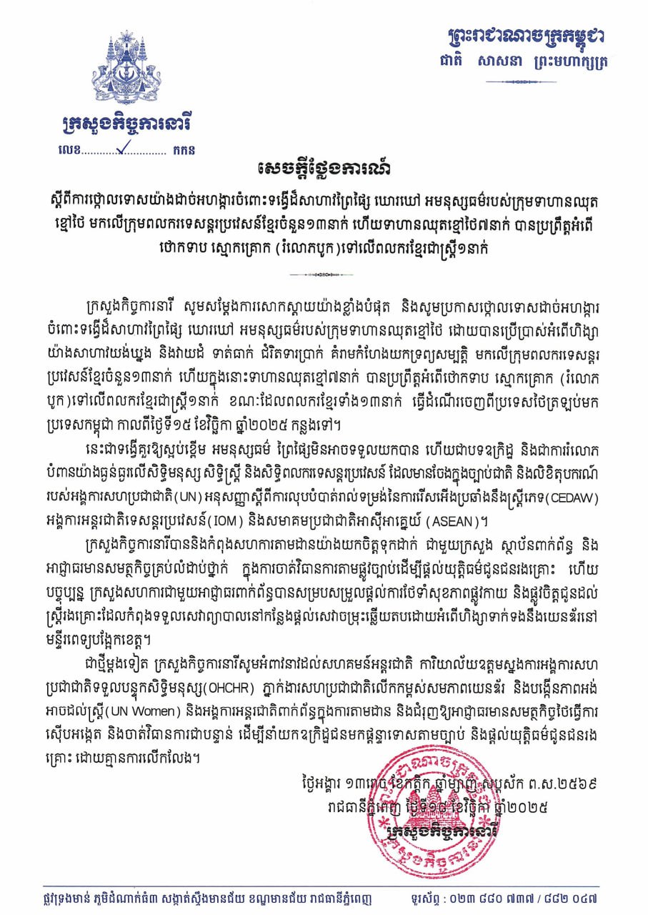 ក្រសួងកិច្ចការនារីកម្ពុជា ប្រកាសថ្កោលទោសដាច់អហង្ការ ចំពោះទង្វើដ៏សាហាវព្រៃផ្សៃ ឃោរឃៅ អមនុស្សធម៌របស់ក្រុមទាហានឈុតខ្មៅថៃ មកលើក្រុមពលករខ្មែរ Posted on ថ្ងៃអង្គារ, 18 ខែវិច្ឆិកា, 2025ថ្ងៃអង្គារ, 18 ខែវិច្ឆិកា, 2025