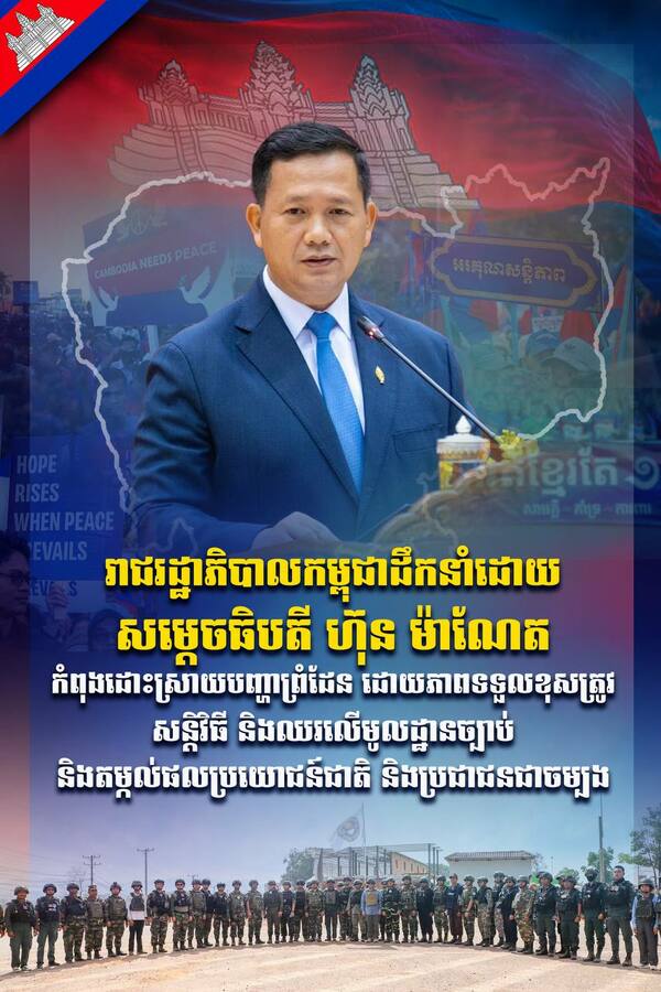 រាជរដ្ឋាភិបាលកម្ពុជាដឹកនាំដោយសម្តេចធិបតី ហ៊ុន ម៉ាណែត កំពុងដោះស្រាយបញ្ហាព្រំដែនដោយភាពទទួលខុសត្រូវ សន្តិវិធី និងឈរលើមូលដ្ឋានច្បាប់ និងតម្កល់ផលប្រយោជន៍ជាតិនិងប្រជាជនជាចម្បង Posted on ថ្ងៃពុធ, 28 ខែមករា, 2026ថ្ងៃពុធ, 28 ខែមករា, 2026