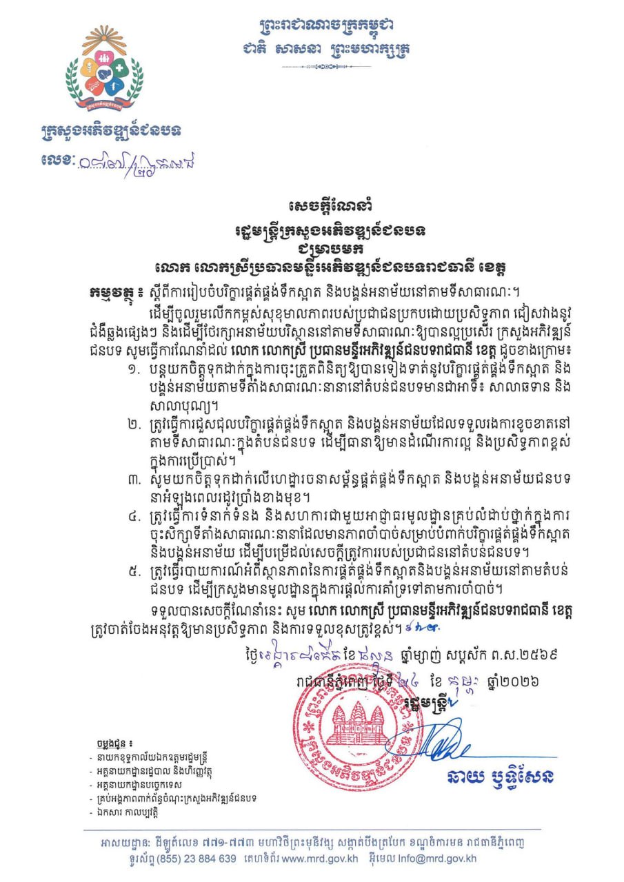 ក្រសួងអភិវឌ្ឍន៍ជនបទ ចេញសេចក្ដីណែនាំស្តីពី ការរៀបចំបរិក្ខារផ្គត់ផ្គង់ទឹកស្អាត និងបង្គន់អនាម័យនៅតាមទីសាធារណៈ Posted on ថ្ងៃពុធ, 25 ខែកុម្ភៈ, 2026ថ្ងៃពុធ, 25 ខែកុម្ភៈ, 2026