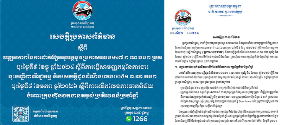 ក្រសួងពាណិជ្ជកម្ម បង្ហាញវឌ្ឍនភាពនៃការដាក់ឱ្យអនុវត្តការរធ្វើសាមញ្ញកម្មនៃការងារចុះបញ្ជីពាណិជ្ជកម្ម និងការលើកលែងការផាកពិន័យ ចំពោះក្រុមហ៊ុនខកខានតម្កល់ប្រតិវេទន៍ប្រចាំឆ្នាំ Posted on ថ្ងៃព្រហស្បតិ៍, 26 ខែកុម្ភៈ, 2026ថ្ងៃព្រហស្បតិ៍, 26 ខែកុម្ភៈ, 2026