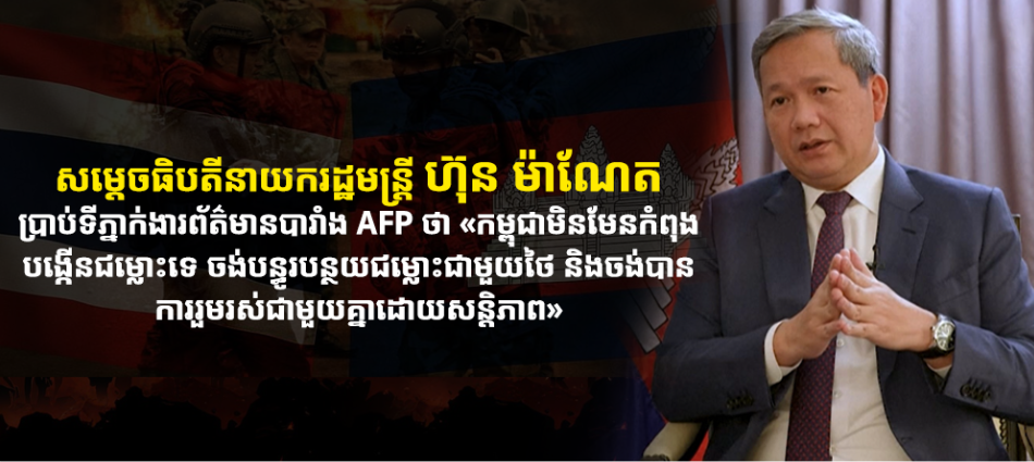 សម្តេចធិបតីនាយករដ្ឋមន្រ្តី ហ៊ុន ម៉ាណែត ប្រាប់ទីភ្នាក់ងារព័ត៌មានបារាំង AFP ថា «កម្ពុជាមិនមែនកំពុងបង្កើនជម្លោះទេ ចង់បន្ធូរបន្ថយជម្លោះជាមួយថៃ និងចង់បានការរួមរស់ជាមួយគ្នាដោយសន្តិភាព» Posted on ថ្ងៃព្រហស្បតិ៍, 26 ខែកុម្ភៈ, 2026ថ្ងៃព្រហស្បតិ៍, 26 ខែកុម្ភៈ, 2026