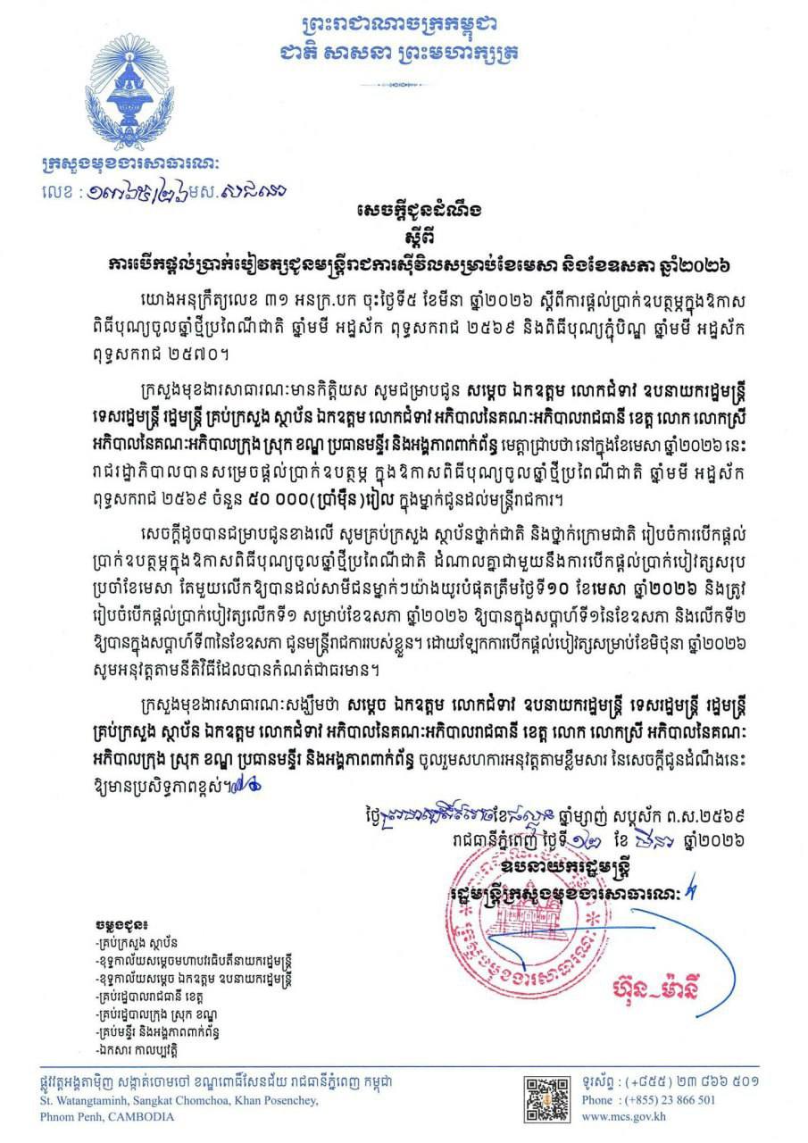 រាជរដ្ឋាភិបាល ឧបត្ថម្ភថវិកាជូនមន្ដ្រីរាជការបន្ថែម៥ម៉ឺនរៀល ក្នុងឱកាសពិធីបុណ្យចូលឆ្នាំថ្មី និងបើកជាមួយប្រាក់បៀវត្សខែមេសា Posted on ថ្ងៃព្រហស្បតិ៍, 12 ខែមីនា, 2026ថ្ងៃព្រហស្បតិ៍, 12 ខែមីនា, 2026