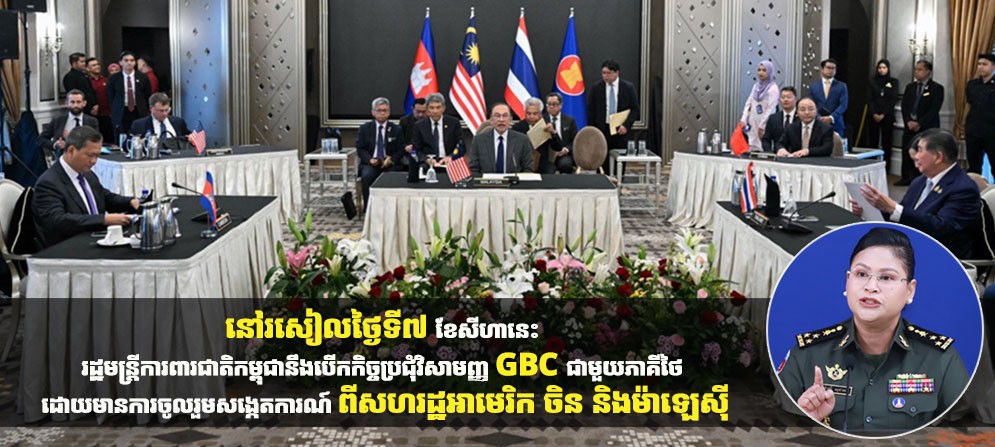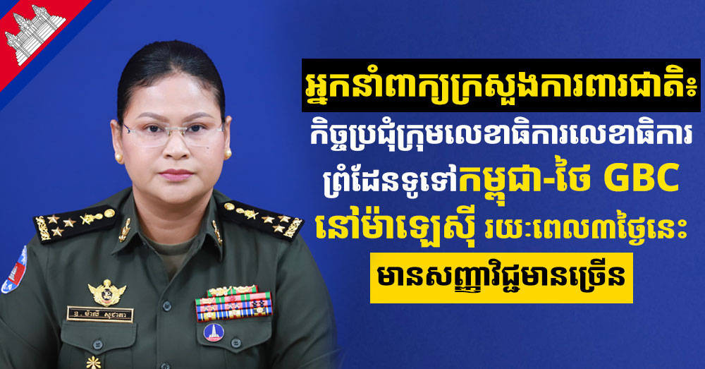 អ្នកនាំពាក្យក្រសួងការពារជាតិ៖ កិច្ចប្រជុំក្រុមលេខាធិការលេខាធិការព្រំដែនទូទៅកម្ពុជា-ថៃ GBC នៅម៉ាឡេស៊ី រយៈពេល៣ថ្ងៃនេះ មានសញ្ញាវិជ្ជមានច្រើន Posted on ថ្ងៃព្រហស្បតិ៍, 7 ខែសីហា, 2025ថ្ងៃព្រហស្បតិ៍, 7 ខែសីហា, 2025