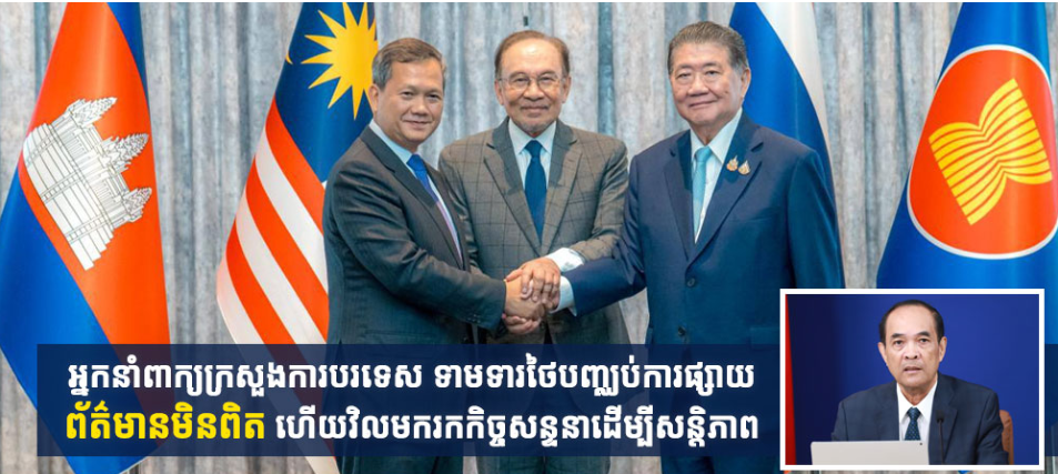 អ្នកនាំពាក្យក្រសួងការបរទេស ទាមទារថៃបញ្ឈប់ការផ្សាយព័ត៌មានមិនពិត ហើយវិលមករកកិច្ចសន្ទនាដើម្បីសន្តិភាព Posted on ថ្ងៃព្រហស្បតិ៍, 7 ខែសីហា, 2025ថ្ងៃព្រហស្បតិ៍, 7 ខែសីហា, 2025