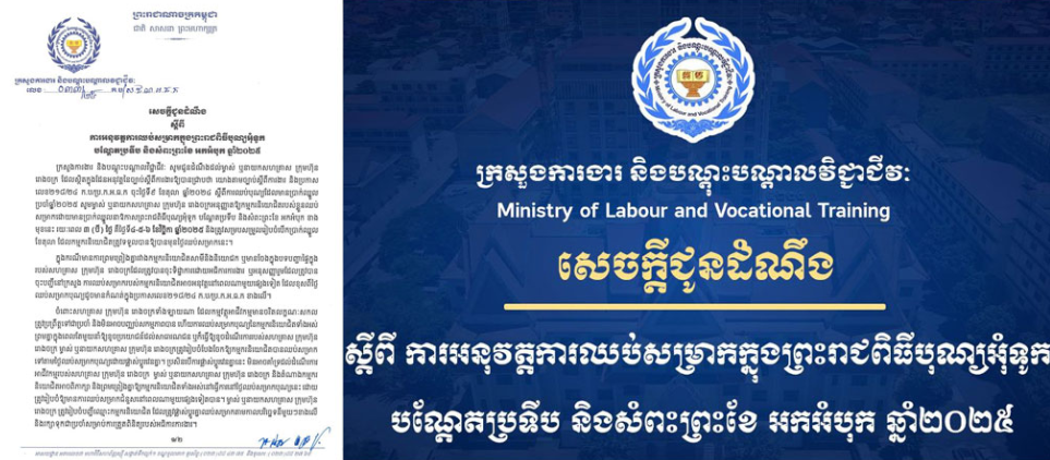 ក្រសួងការងារ ជូនដំណឹងពីការអនុញ្ញាតឱ្យឈប់រយៈពេល៣ថ្ងៃ ចាប់ពីថ្ងៃទី៤-៦ ខែវិច្ឆិកា ក្នុងឱកាសព្រះរាជពិធីបុណ្យអុំទូក Posted on ថ្ងៃព្រហស្បតិ៍, 23 ខែតុលា, 2025ថ្ងៃព្រហស្បតិ៍, 23 ខែតុលា, 2025