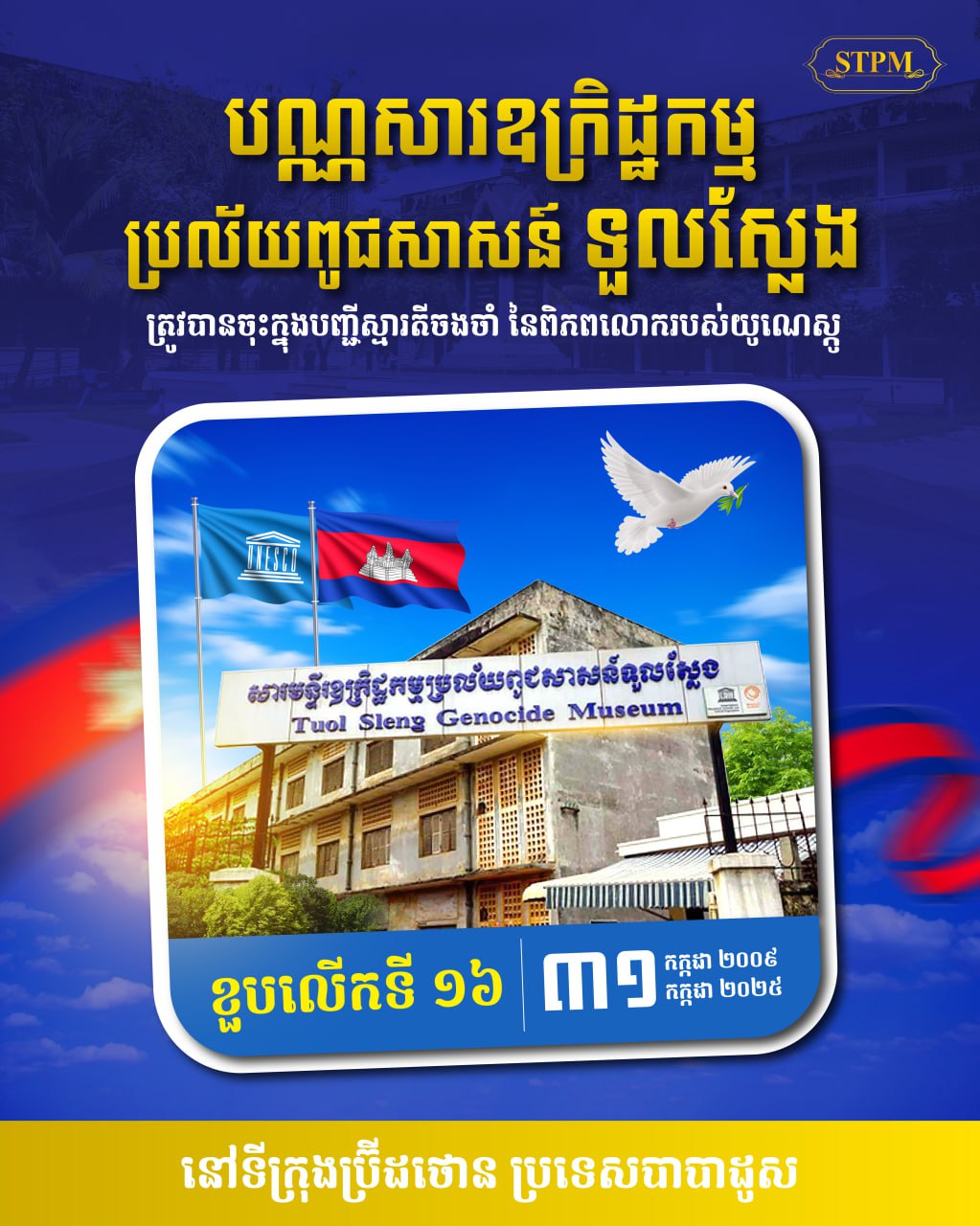 សម្តេចបវរធិបតី ហ៊ុន ម៉ាណែត អបអរសាទរខួបលើកទី១៦ នៃបណ្ណសារឧក្រិដ្ឋកម្មប្រល័យពូជសាសន៍ ទួលស្លែង ត្រូវបានចុះក្នុងបញ្ជីស្មារតីចងចាំនៃពិភពលោក របស់អង្គការយូណេស្កូ Posted on ថ្ងៃព្រហស្បតិ៍, 31 ខែកក្កដា, 2025ថ្ងៃព្រហស្បតិ៍, 31 ខែកក្កដា, 2025