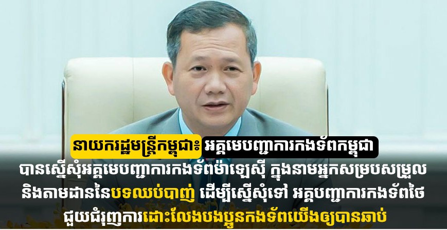 នាយករដ្ឋមន្រ្តីកម្ពុជា៖ អគ្គមេបញ្ជាការកងទ័ពកម្ពុជា បានស្នើសុំអគ្គមេបញ្ជាការកងទ័ពម៉ាឡេស៊ី ក្នុងនាមអ្នកសម្របសម្រួល និងតាមដាននៃបទឈប់បាញ់ ដើម្បីស្នើសុំទៅ អគ្គបញ្ជាការកងទ័ពថៃ ជួយជំរុញការដោះលែងបងប្អូនកងទ័ពយើងឲ្យបានឆាប់ Posted on ថ្ងៃព្រហស្បតិ៍, 31 ខែកក្កដា, 2025ថ្ងៃព្រហស្បតិ៍, 31 ខែកក្កដា, 2025